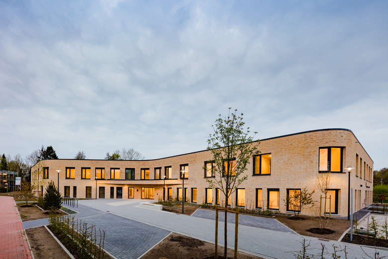 Der Neubau der Fachklinik nimmt die zentralen städtebaulichen Achsen der angrenzenden Gebäude auf dem Klinikgelände auf und folgt der geschwungenen Linie der Norderbäke. Dadurch erhält der Baukörper seine charakteristisch fließende Struktur und verschmilzt zu einem einzigartigen Gebäudekubus. Die bereits vorhandenen Gebäude auf dem Klinikgelände bestehen aus rotem Sichtmauerwerk. Der Neubau nimmt das vorhandene Material „Ziegel" auf, setzt sich aber durch seine helle Sandsteinfarbe von den vorhandenen Klinikgebäuden ab.