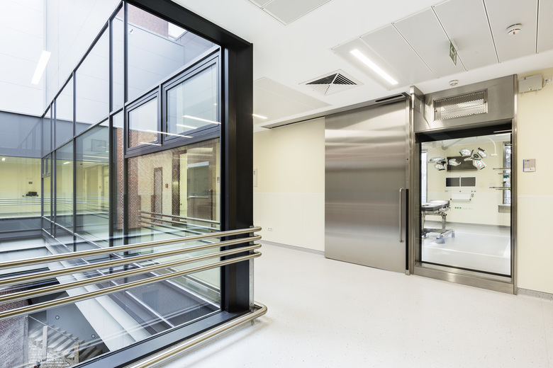 Ein elementares und funktionales Element ist der großzügige Lichthof. Er versorgt die zentrale Sterilgutversorgung und die vorhandenen OP-Säle mit Tageslicht. Gleichzeitig sichert der Gebäudeeinschnitt die natürliche Belichtung auch in den unteren Ebenen.