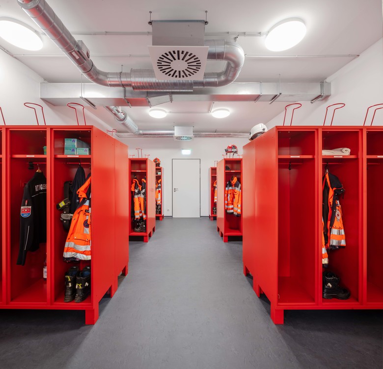 Durch die Zonierung der Nutzungsbereiche Aufenthalt - Umkleiden / Lager / Technik - Fahrzeughalle ist eine übersichtliche Raumanordnung und Wegeführung entstanden. Die Umkleidebereiche wurden als Schleusen mit Schwarzweiß-Trennung konzipiert.