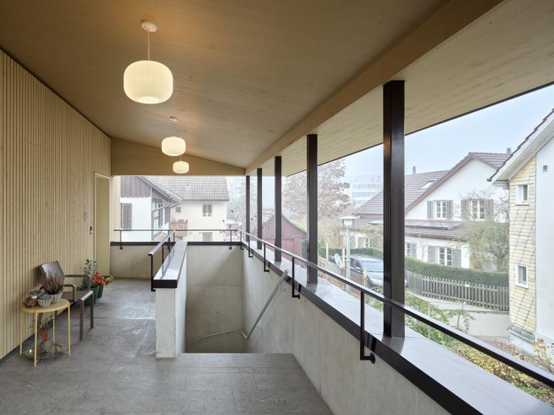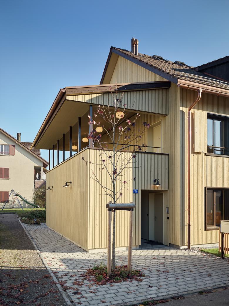 Der Neubau in der Kernzone von Winterthur - Wülflingen ersetzt ein ehemaliges Kleinbauernhaus und musste gemäss Vorgabe der städtischen Denkmalpflege den gleichen Fussabdruck auf der Parzelle besetzen. Statt einer Wohnung sind nun drei Wohnungen im neuen Gebäude möglich. Im Bereich des ehemaligen Schopfanbaus im Norden ist das neue Treppenhaus zur Erschliessung der beiden Maisonettewohnungen aussenliegend platziert. Dadurch wird die gesamte Grundfläche des Hauptgebäudes für das Wohnen genutzt. Der Bau wurde in Holzelementen geplant und gebaut, mit Decken in Holz-Betonverbund konnten sämtliche Schall- und Brandschutzanforderungen erfüllt werden. Die hinterlüftete gestrichene Holzschalung verleiht dem Wohnhaus in der Kernzone einen frischen und modernen Ausdruck. Die Holzmetallfenster mit aussenliegenden Metallzargen sind innenseitig zusammen mit den Leibungen in Sichtholz ausgeführt und verleihen den Innenräumen zusammen mit den Eichenparkettböden und den massiven Sichtholzdecken eine angenehme und natürliche Raumstimmung. In den Obergeschossen liegen die zwei in Längsrichtung getrennten Maisonettewohnungen mit den Wohnräumen und der Küche im Zugangsgeschoss. Die Schlafzimmer und Bäder sind über eine innenliegende Treppe im Dachgeschoss angeordnet und durch Dachgauben belichtet. Auf den Stirnseiten liegen für diese Wohnungen eine offene Terrasse nach Süden und eine gedeckte nach Norden.