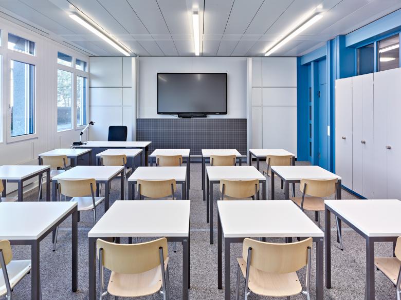 Eine zurückhaltende und aufeinander abgestimmte Farbgebung der Böden, Fronten und Rüstflächen lassen einen lebendigen und farbenfrohen Unterricht zu.