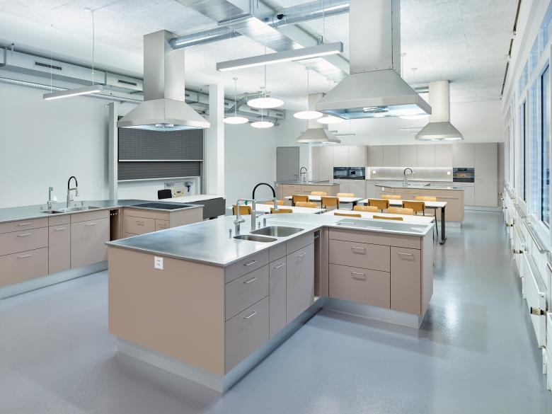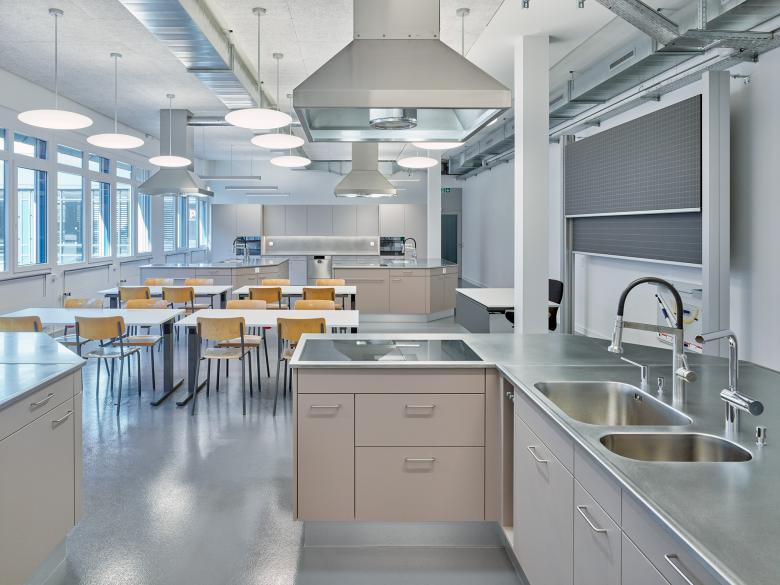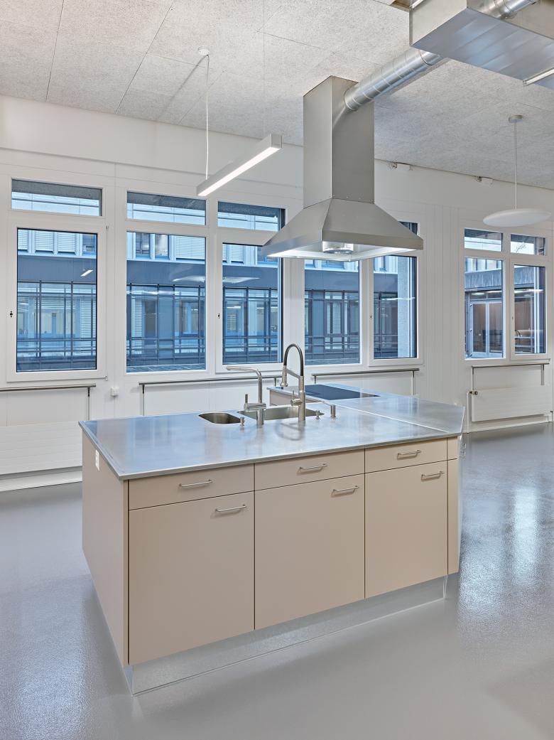 Zwei nebeneinanderliegende Schulküchen mit je vier Kochinseln, Küchenschrankfronten, Waschstrassen und Garderoben benötigen vorallem eine gute Raumlüftung. Lüftungskanäle zu den Abzugshauben, Anschlüsse Sanitär und Elektro über den bestehenden Doppelboden und robuste, unterhaltsarme Oberflächen bilden die Grundlage für den zweckmässigen Einbau. Eine der Küchen kann zudem als Gastroküche für grössere Anlässe genutzt werden.
