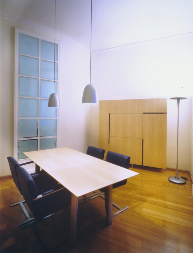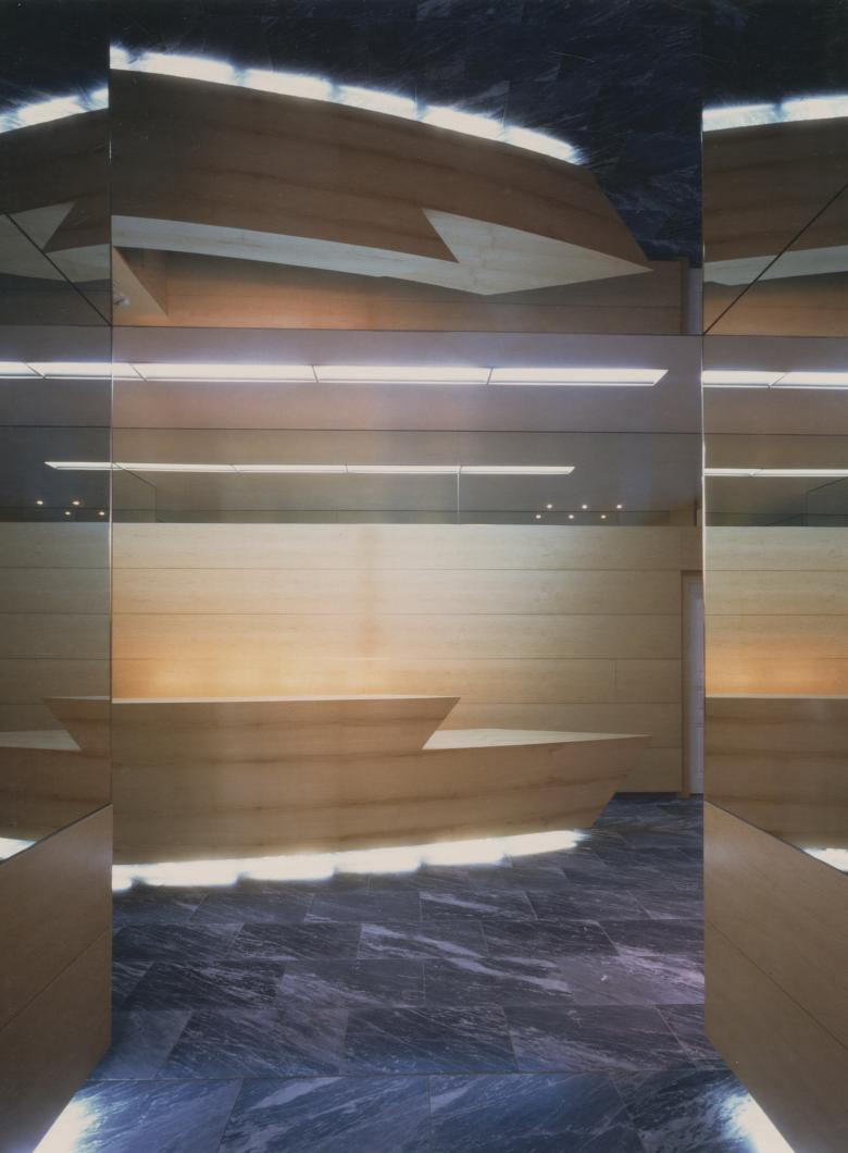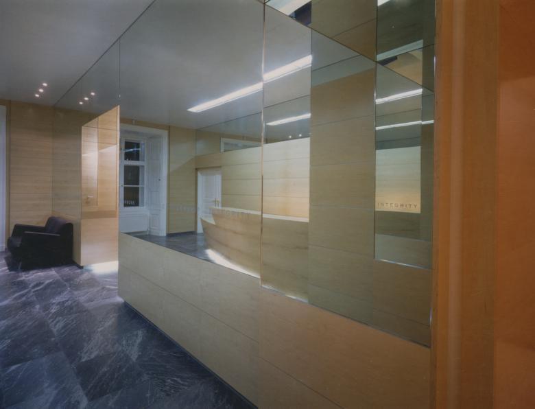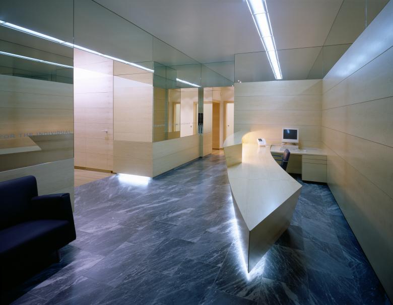 Das beginnt beim Foyer: Das große, geschwungene Pult dominiert den Raum und gibt doch gleichzeitig die Richtung an, leitet den Besucher mit sanfter Dynamik weiter. Der Durchgang zum Korridor wurde ganz geöffnet und eine Blickbeziehung vom Foyer bis zur Chefsekretärin geschaffen.