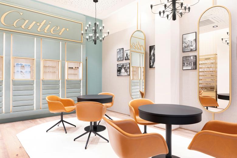 Wir haben das Projekt gelöst, indem wir ein exklusives Designkonzept entwickelt haben, das perfekt zur Zielgruppe von „Rottler Exklusiv“ passt. Das Farbkonzept aus Dunkelgrün, Petrol, Minze, mattem Schwarz und Perlgold betont die luxuriöse Atmosphäre, während wir die hohen Decken durch filigran montierte Spiegel und Kronleuchter in Szene gesetzt haben. Indirekt beleuchtete Vorhänge, ein warmer Echtholzboden und eine abgehängte Decke schaffen zusätzlich eine gemütliche Atmosphäre. Ein wichtiger Teil des Projekts war die Verbindung zwischen dem neuen Exklusivgeschäft und dem angrenzenden, regulären Rottler-Geschäft. Diese Herausforderung haben wir durch die Planung von zwei Durchgängen gelöst, die die beiden Bereiche harmonisch miteinander verbinden und den Kunden ein fließendes Einkaufserlebnis bieten. Die Sicherheit der hochwertigen Brillen spielte ebenfalls eine große Rolle. Hier haben wir eine spezielle Lösung entwickelt, indem wir die grüne Präsentationswand mit Glasschiebetüren ausgestattet und alle Vitrinen mit elektronischen Schlössern versehen haben. Das gewährleistet sowohl den Schutz der wertvollen Ware als auch eine elegante Präsentation.