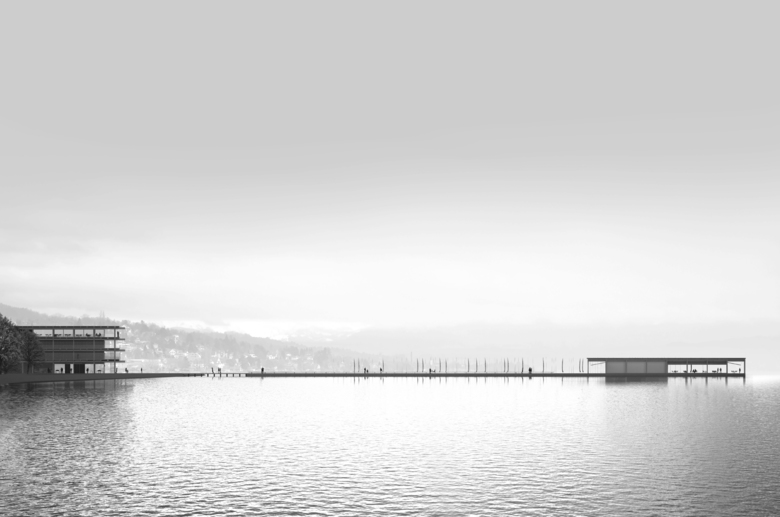 Mit der städtebaulich präzisen Setzung entsteht ein spannender Dialog zweier Gebäude: ein landseitiges Wassersportzentrum und Restaurant steht genau in der Achse und als Auftakt einer 17m breiten und 150m langen, im Züriseee schwimmenden Mole. An deren Ende sich dann als baulicher Abschluss und bezugnehmendes Gegenüber eine Buvette an bester Lage mitten im See befindet.