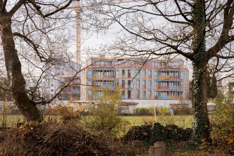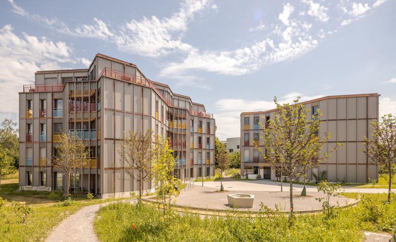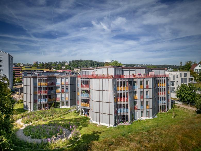 Die beiden Ersatzneubauten für 35 Wohnungen befinden sich in Zürich-Affoltern, im Übergang zwischen Stadt und Landschaft. Diese besondere Lage am Siedlungsrand spiegelt sich sowohl in der Setzung, dem Gebäudeausdruck, als auch der Gestaltung des umfliessenden Grüns wider. Die Umgebungsgestaltung orientiert sich an dieser Dualität, indem Blumenwiesen, Ostbäume und ein üppig-wilder Schmetterlingsgarten von der Naturseite im Norden um die Gebäude herum in die Siedlung hineinfliessen, während sich gleichzeitig die beiden Gebäude auf ihrer dem Siedlungsraum zugewandten Südseite um einen klar gestalteten Gemeinschaftsplatz gruppieren. Dieser Platz bildet im übergeordneten siedlungsinternen Kontext der Baugenossenschaft zugleich Abschluss, als auch Höhepunkt einer sonst gassenartig gestalteten Siedlungsumgebung. Unter einem geometrischen Baumkörper aus fröhlich blühenden Judasbäumen laden eine grosszügige Rundbank, sowie ein plätscherner Brunnen zu gemeinschaftlichen Treffen & lebendigem Miteinander ein. Hat man einmal genug vom Trubel, so kann man sich unbemerkt in den ruhigen, zur Landschaftsseite ausgerichteten und mit blühenden einheimischen Wildstauden bepflanzten Schmetterlingsgarten zurückziehen und lustwandelnd zusammen mit den Schmetterlingen wie auf Wolken träumen oder einfach nur in Ruhe ein Buch im Grünen lesen.