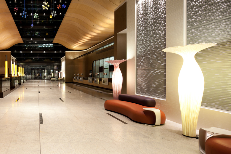 Bei der Ankunft in der Lobby bekommt der Gast einen im wahrsten Sinne des Wortes beeindruckenden Empfang, denn die Umsetzung dieses Spagates zwischen Dynamik und Entschleunigung wird hier sofort erleb- und spürbar. Die riesigen Dimensionen der hohen, modernen Lobby werden durch die goldenen, wie Flügel geschwungenen Dächer angenehm auf die Ebene des menschlichen Horizontes gesenkt. Der Gast landet also ganz sanft und kann in geschützter Atmosphäre herunter- und ankommen. Auch der Rezeptionstresen vereint Gegensätze: Kuben aus satiniertem Edelstahl, mit eingefasstem, lackiertem Glas werden durch einen organisch geformten Körper aus Leder und dunkler Räuchereiche miteinander verbunden. Eyecatcher sind die kleinen Aufsatzleuchten aus poliertem Aluminium, die in ihrer runden, mit geschwungenen Linien durchzogenen Form eine kleine Reminiszenz an die Außenhaut des Gebäudes darstellen.