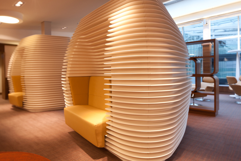 Für Veranstaltungen von bis zu 570 Personen wartet der Ballsaal "The Globe" auf Besucher. Konzipiert als Haus im Haus spielt er in seiner organischen Form auf die Architektur des THE SQUAIRE an, und auch seine silbrige Hülle aus Glasmosaik reflektiert das Licht ähnlich effektvoll wie das Äußere des Gebäudes. Strahlend geht es im Inneren weiter. In die Wände eingelegte Swarovski-Kristalle, die wie Leuchtstreifen durch den Raum zu "blitzen" scheinen, sorgen zusammen mit den wellenförmigen Lichtvouten in der Decke für mehr als beeindruckende Lichteffekte. Natürlich kann der Saal auch für größere (oder geteilt für kleinere) Business-Meetings in Anspruch genommen werden, wobei zusätzlich diverse Konferenzräume auf der Lobby-Ebene zur Verfügung stehen. Auf Gäste der Executive Zimmer wartet in Ebene zehn zudem die mit vielen Features ausgestattete "Executive Lounge". Computer lassen sich hier unsichtbar in den großzügigen Empfangstischen versenken, deren edle, dunkelbraune Oberfläche aus Nussbaum einen idealen Kontrast zu den hellen Lamellen-Fronten bildet – wieder eine kleine Hommage an die dynamische Außenhaut des Gebäudes. Im Gegensatz dazu haben die Lamellen bei den freistehenden Sitznischen aus hellem Leder einen behaglichen "Cocooning-Effekt". An diesem Ort lässt es sich ungestört, abgeschirmt arbeiten. Natürlich können Gäste sich ebenso in eine der gemütlichen Lounge-Bereiche oder in die Bibliothek zurückziehen, wo man in den komfortablen hellen Ledersesseln auch entspannt auf einen verspäteten Flug warten kann. Falls der Flieger doch früher gehen sollte, wartet ein early-bird Frühstück im Buffetbereich - mit ihrem belebenden, leuchtenden Pink vertreibt die Beleuchtung hier etwaige Müdigkeit sofort auf angenehme Art.