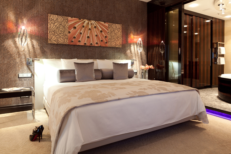 Das Design der Präsidentensuite spiegelt eine für den Standort Frankfurt ideale "sophisticated internationality" wider, die keine Wünsche offen lässt. Der luxuriöse Schlafbereich ist in edlen silber-grau Tönen gehalten. Die kleinen Kronleuchter über den Nachttischen tauchen den Raum in ein gehobenes Licht und werfen schöne Schatten auf die dezent florale Tapete. Das Bad gleicht einer Wellnessoase: die freistehende schwarze Jaccuzzibadewanne wurde extra von einer Künstlerin aus Fliessbelag mit eingefassten Metallstreifen angefertigt und auch der Spiegel mit Perlmuttumrahmung sowie der gold-schwarze Granit unterstützen diese Wertigkeit, die von der Wand im Loungebereich, die mit 18-karätigem Blattgold belegt wurde, sogar noch übertroffen wird.