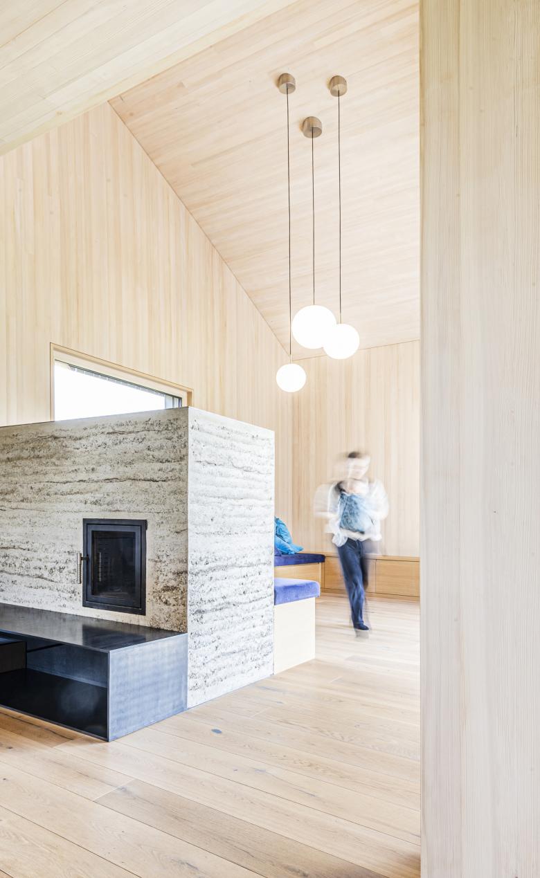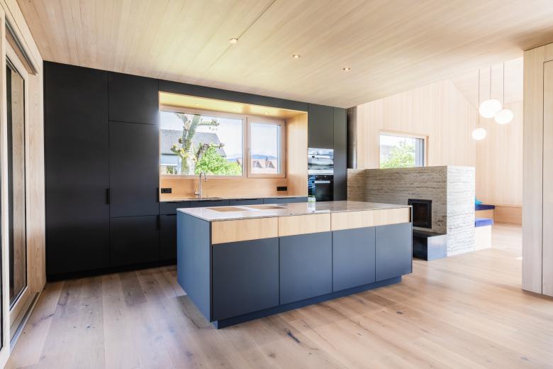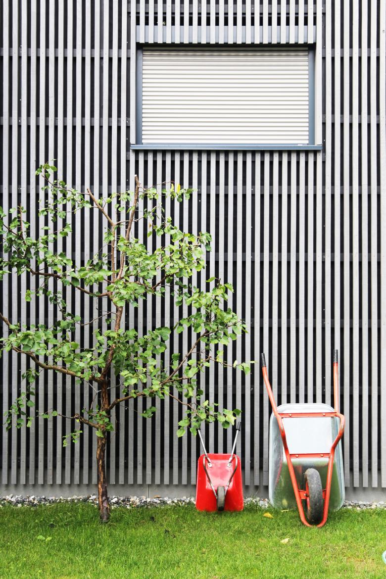 Im nördlichen Rheintal, am Ortsrand von Lauterach, liegt das Grundstück eingebettet in einer kleinteiligen Struktur von Einfamilienhäusern. In der dichten Bebauung positioniert sich der Baukörper eigenständig und fügt sich mit seiner dreiteiligen Kubatur stimmig in die Umgebung ein. Das Gebäude rückt von der Straße im Süden ab und orientiert sich in Nord-Südrichtung.