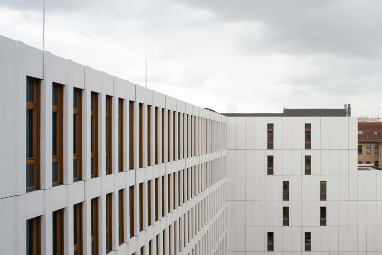 Der Neubau im Innenhofbereich soll als einfacher, klar gegliederter Verwaltungsbau mit einer ruhigen Gestaltung die beiden Bestandsbauten verbinden. Die sechsgeschossige hinterlüftete Fassade aus hellen Betonfertigteilen wird dabei horizontal in drei Teile gegliedert, die vertikal jeweils zwei Geschossebenen verbinden. Diese gewählte Aufteilung nimmt die Gebäudehöhe zurück und vermittelt so gegenüber den viergeschossigen Wohnhäusern. Der neue Baukörper ist zum Amtsgericht hin vom Erdgeschoss bis zum 2. Obergeschoss breiter und springt dann in den oberen Geschossen zurück. Dadurch wird der nüchtern wirkende und rd. 70 Meter lange Baukörper gegliedert und harmonisch strukturiert.