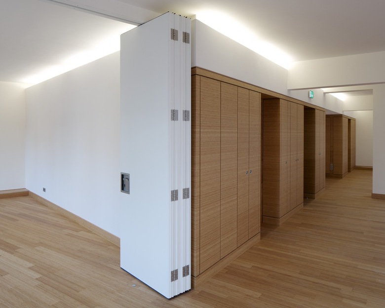 Jede Etage erhielt als Grundausstattung ein raumhohes, multifunktionales Einbaumöbel, welches sich über die gesamte Länge der Grundrisse erstreckt und deren Rückgrat bildet. Hier befindet sich die Medientechnik, großzügige Lagerflächen sowie der Zugang vom Treppenhaus als auch die Zugänge zu Teeküche und Toilettenbereich.