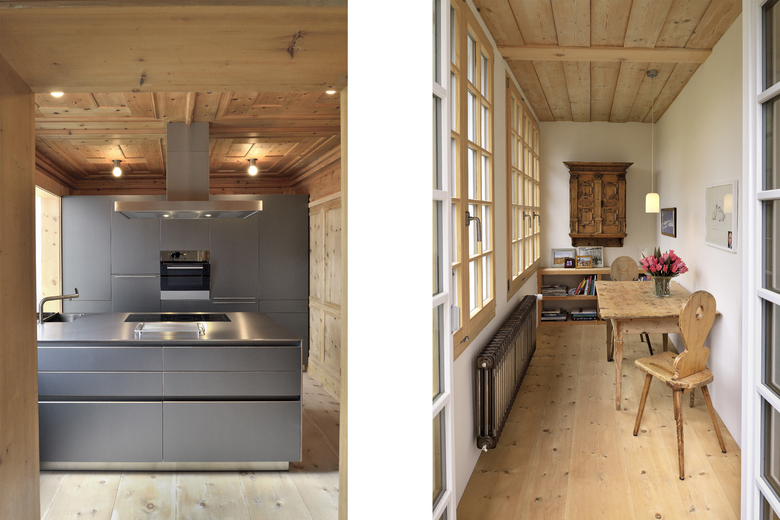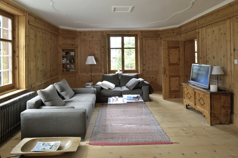 Die Erdgeschosswohnung der Heimatstil-Villa wurde durch ein paar Eingriffe sowie das Entfernen der Sünden aus den 80er Jahren sanft saniert. Die Höhe der Räume, Stuck und Arven-Täfer sind original erhalten. Küche, Bäder und Bodenbeläge sind grösstenteils erneuert worden. Durch neue Fenster im Wintergarten wurde dieser Bewohnbar gemacht.