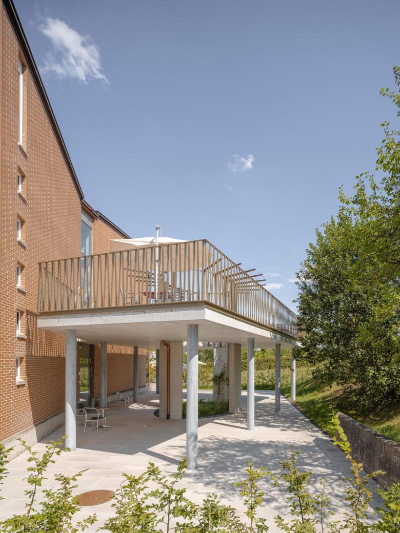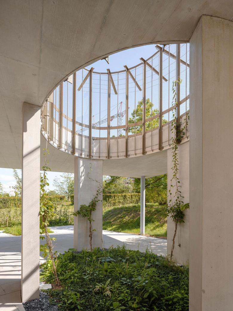 Der südseitige Terrassenanbau im ebenfalls neu errichteten Demenzgarten erscheint als schwebende Plattform mit einer elliptischen Öffnung, die ein spielerisches Licht- und Schattenspiel während des ganzen Tagesverlaufs zulässt.
