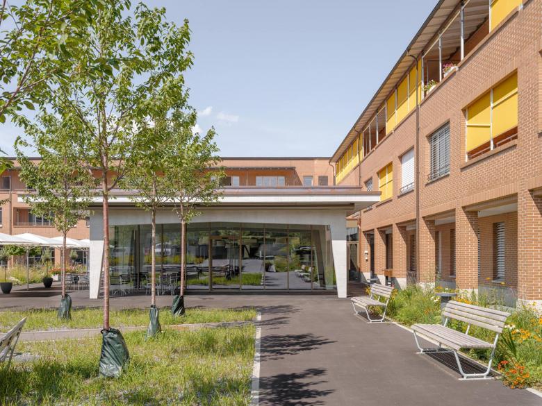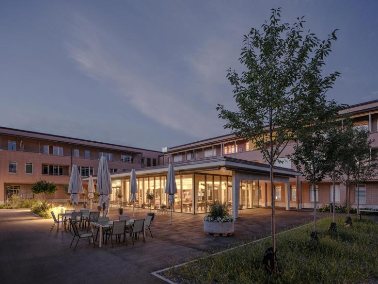 Der Pavillon wird zum neuen Eingang und Treffpunkt im AZH. Grosszügige Verglasungen und ein gedeckter Aussensitzplatz verbinden das Neubauvolumen mit dem Hofgarten, welcher gemeinsam mit dem Neubau der Alterswohnungen „Nägelihof“ neu organisiert und gestaltet wurde.
