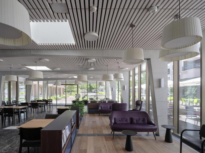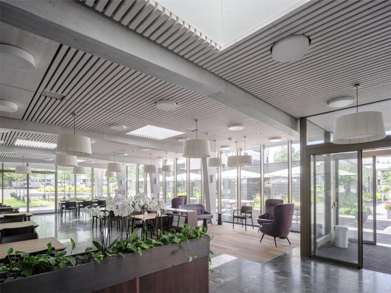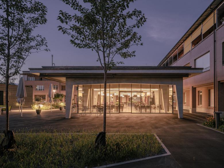 Ein eingeschossiger Pavillonbau, welcher sich an das heutige Foyer im Erdgeschoss niveaugleich andockt, beherbergt das neue Restaurant für Bewohnende und weiteres Publikum.