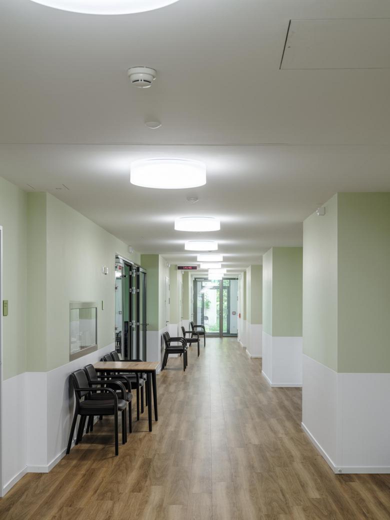 Die Umbauarbeiten im Innern orientieren sich an der bestehenden Raum- und Tragstruktur. Die klassische Anordnung von Mittelgang und beidseitigen Raumschichten wird respektiert und nicht verändert. Im bestehenden Erdgeschoss ist neu eine Demenzstation mit 12 Betten platziert. Im Weiteren erfolgte der Ersatz des Restaurationsbereichs und die Heimküche im Erdgeschoss nach den Bedürfnissen des neuen Verpflegungskonzeptes und den heutigen Anforderungen an die Gastronomie eines Alterszentrums.