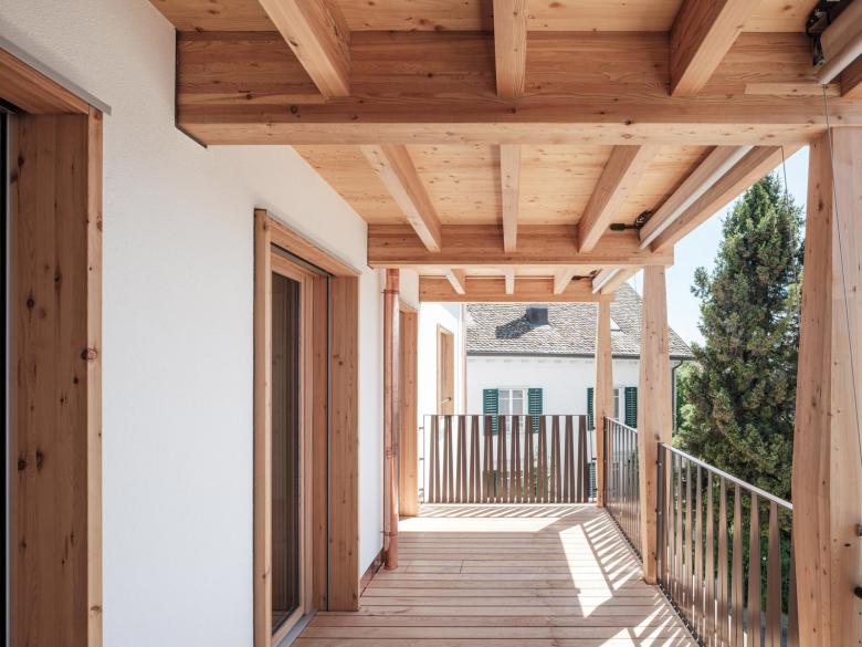 Konstruktiv ist das Haus im Sockelgeschoss zur erdanstossenden Hangseite als Massivbau in Beton konstruiert. Darüber und um den ebenfalls betonierten Treppenhauskern, wurde ein vorfabrizierter, dreigeschossiger Holzbau entwickelt.