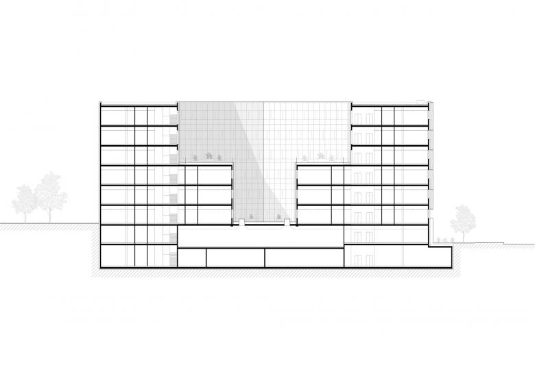 Die Fassade spiegelt die interne Organisation durch einen präzisen Rhythmus von Öffnungen und horizontalen Gliederungen wider. Große Fenster sorgen für viel Tageslicht in den Arbeitsräumen und betonen gleichzeitig Transparenz und Offenheit. Ein begrünter Innenhof mit Fassadenbegrünung und Freiflächen versorgt die angrenzenden Arbeitsräume mit natürlichem Tageslicht und trägt zur Verbesserung des Mikroklimas bei
