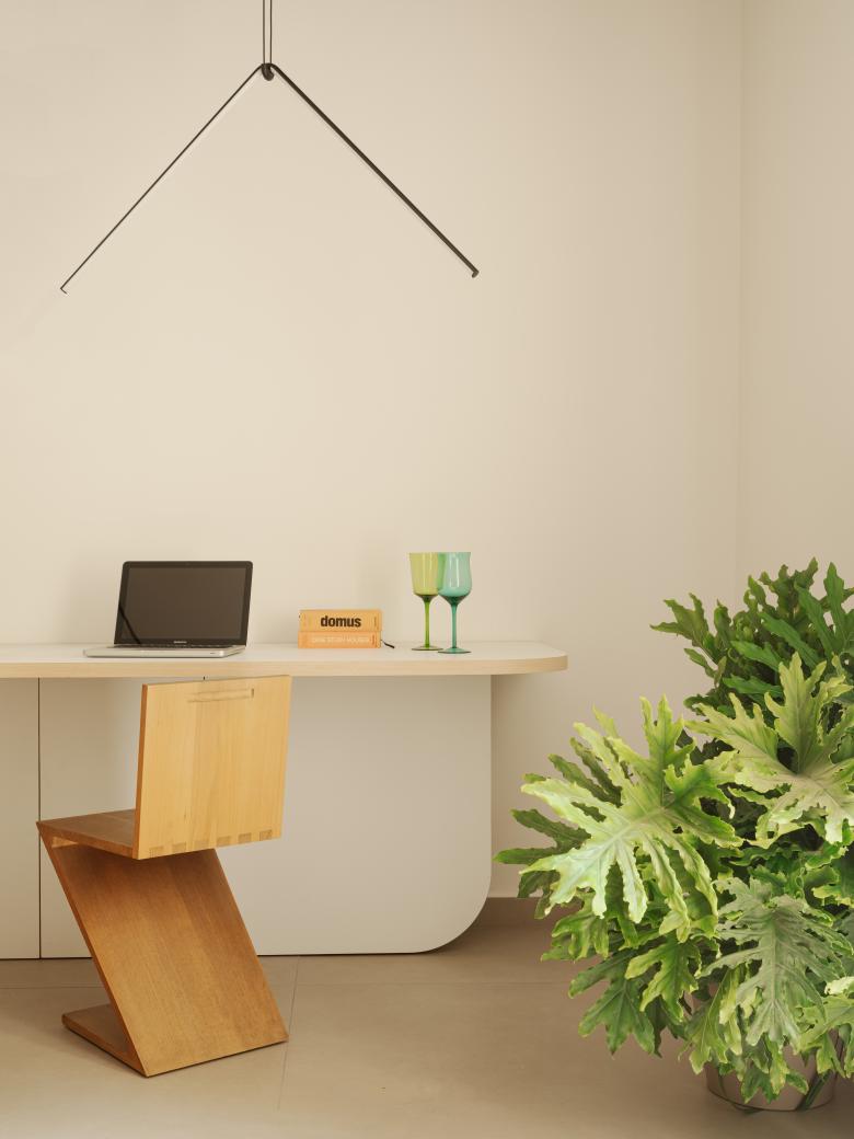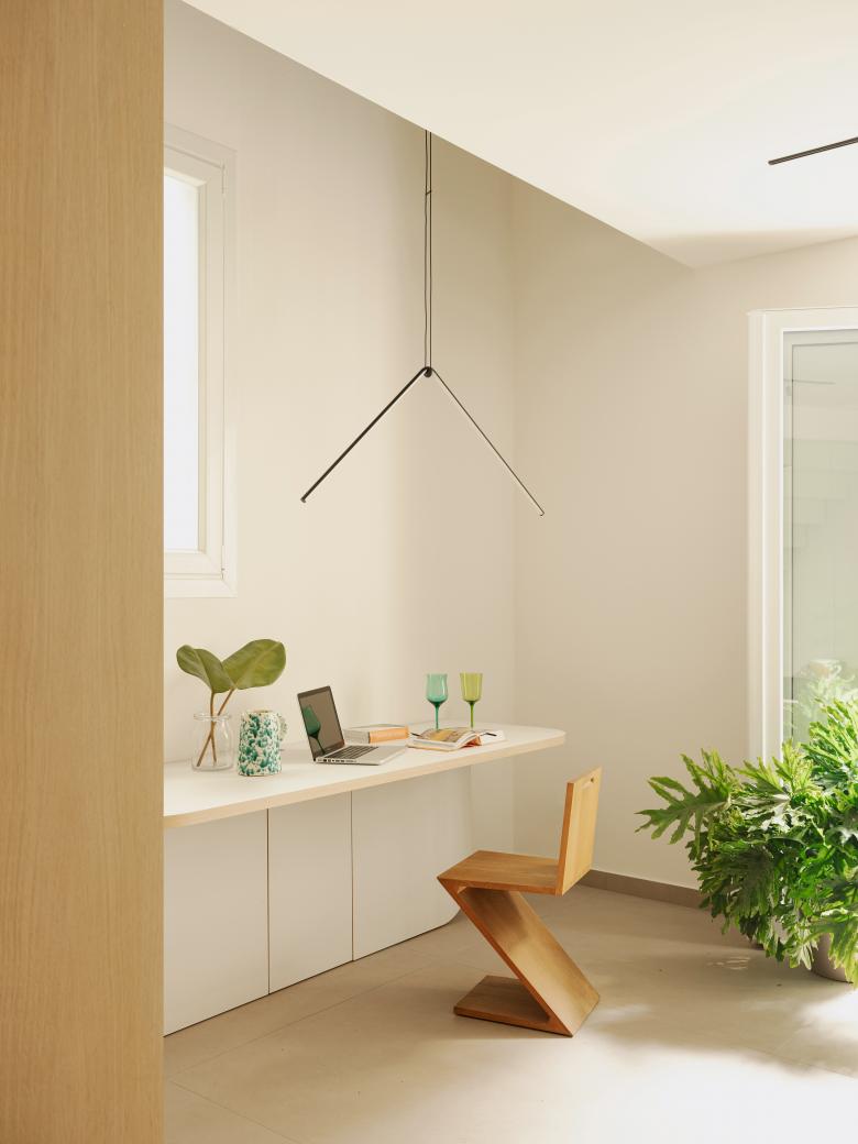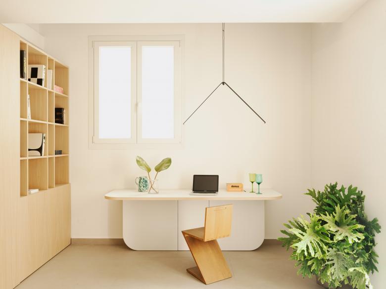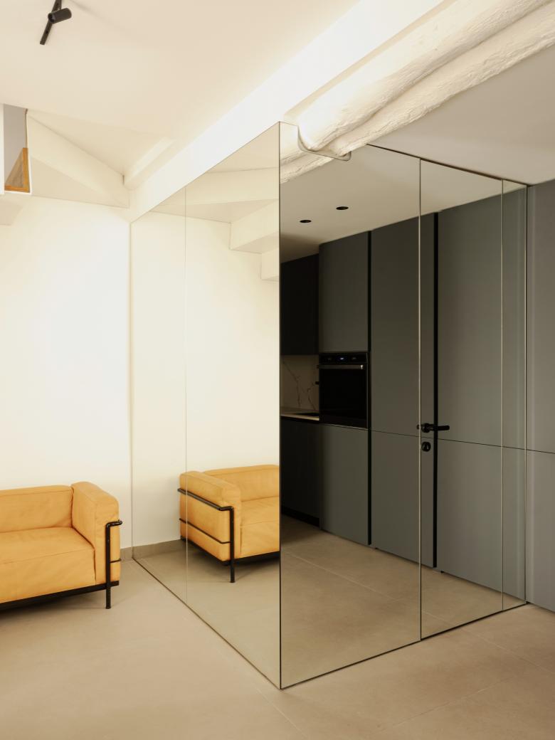 Al piano terra vengono collocati una zona giorno con uno spazio di lavoro su disegno, un piccolo angolo cucina ed il bagno, quest’ultimo rivestito da una boiserie di specchi che ne smaterializza e nasconde il volume.