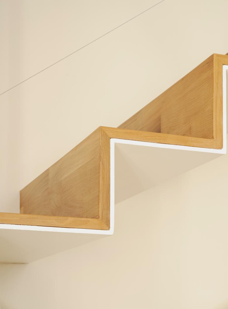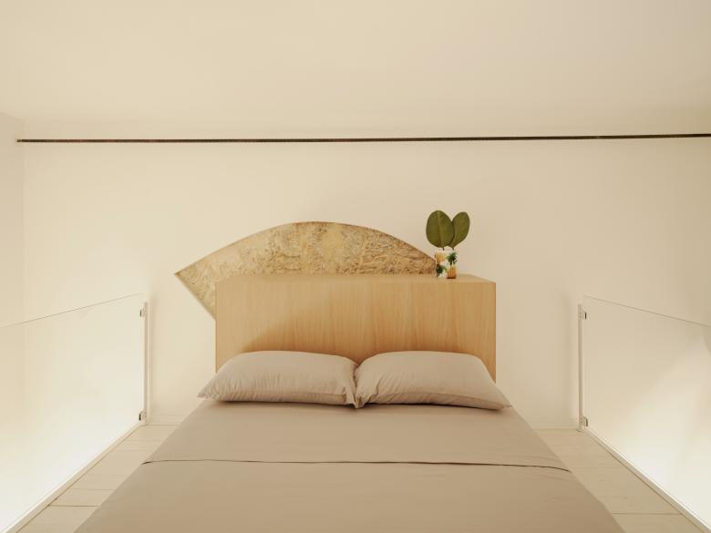 Si accede al piano superiore attraverso una scala in lamiera piegata, alzata e pedata sono rivestite in massello di teak mentre il parapetto è su disegno, qui viene inserito un letto contenitore mentre il pavimento in doghe di legno è interamente dipinto di bianco.