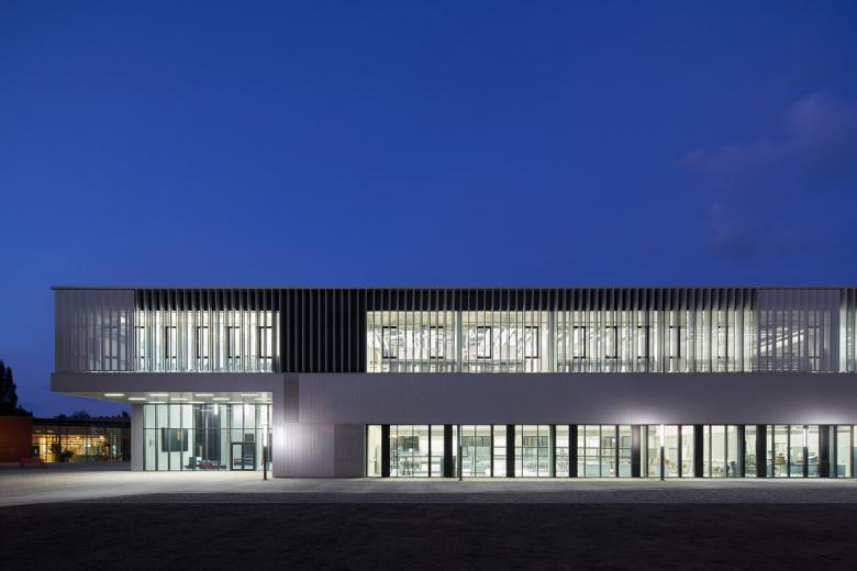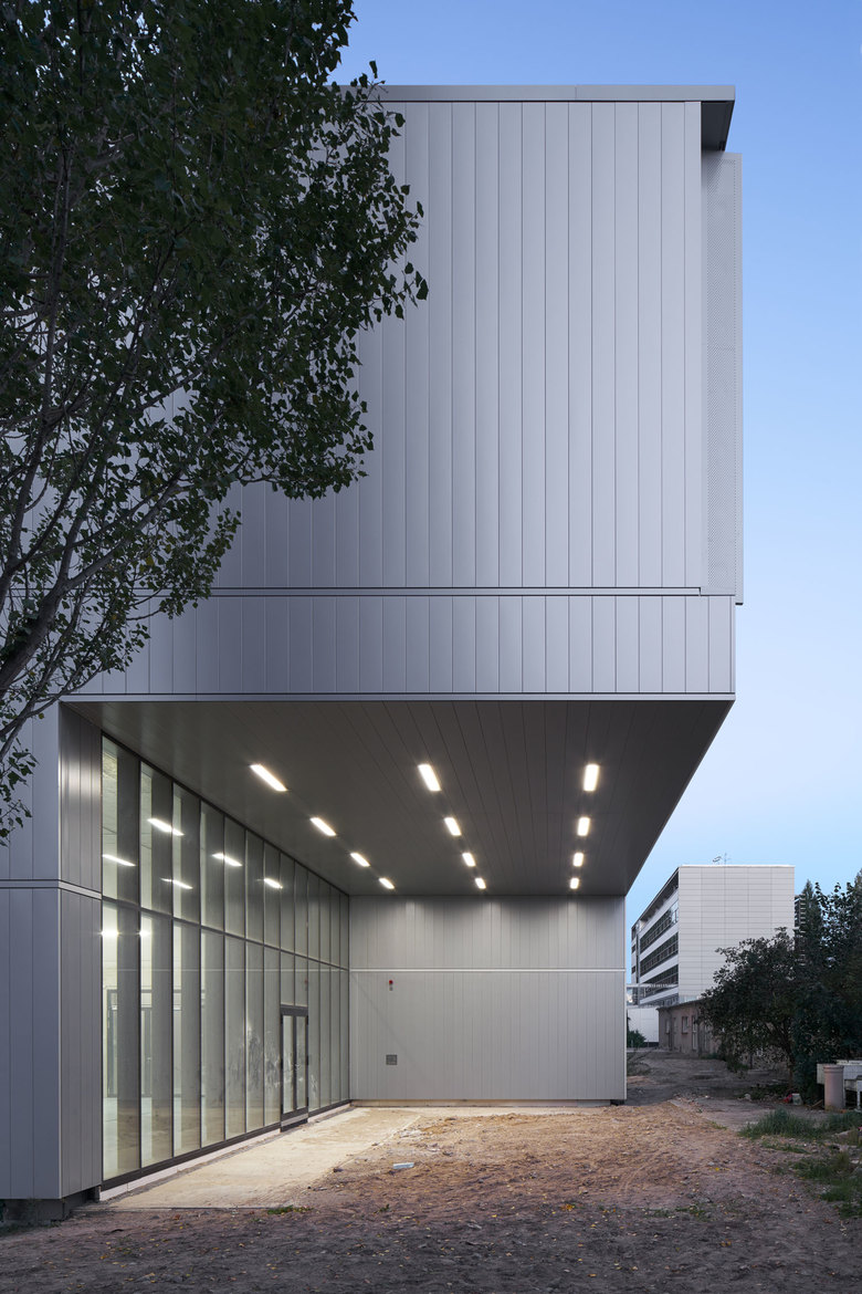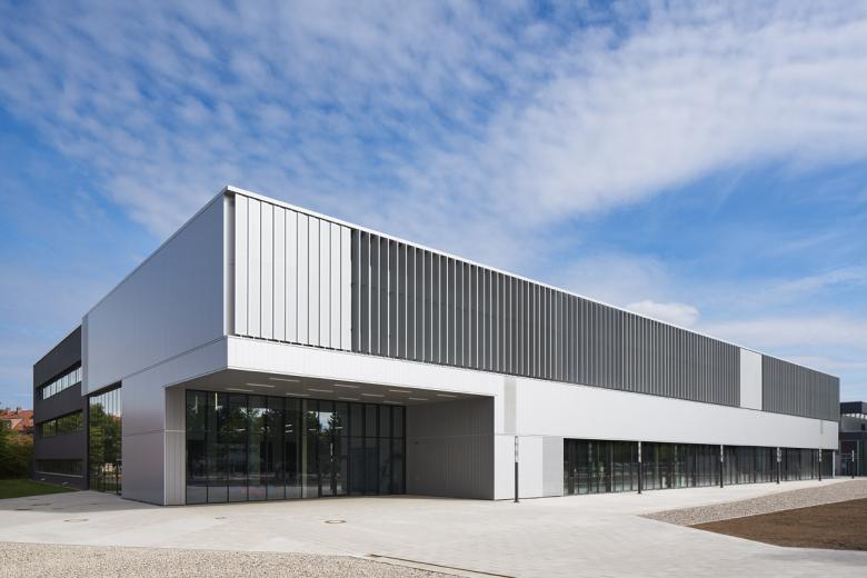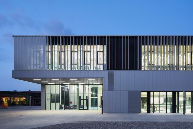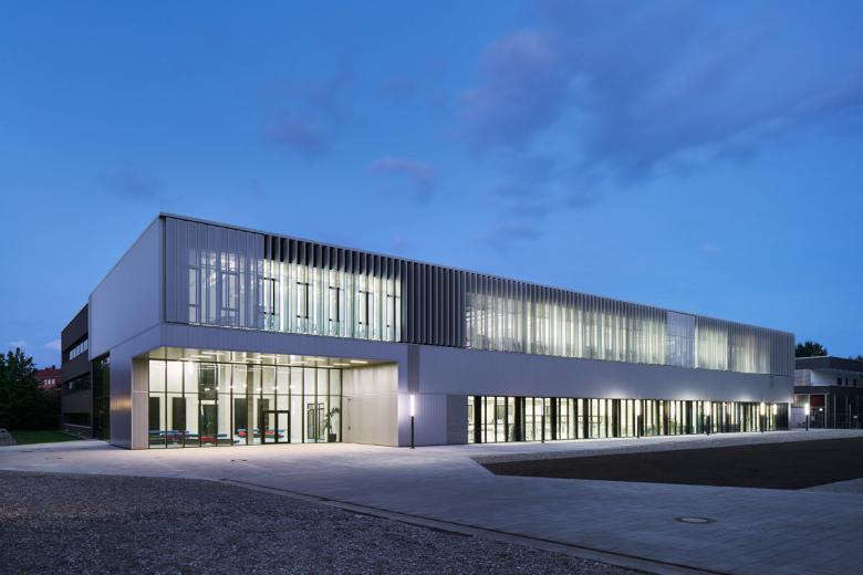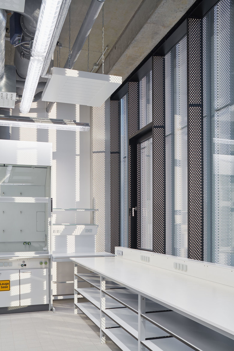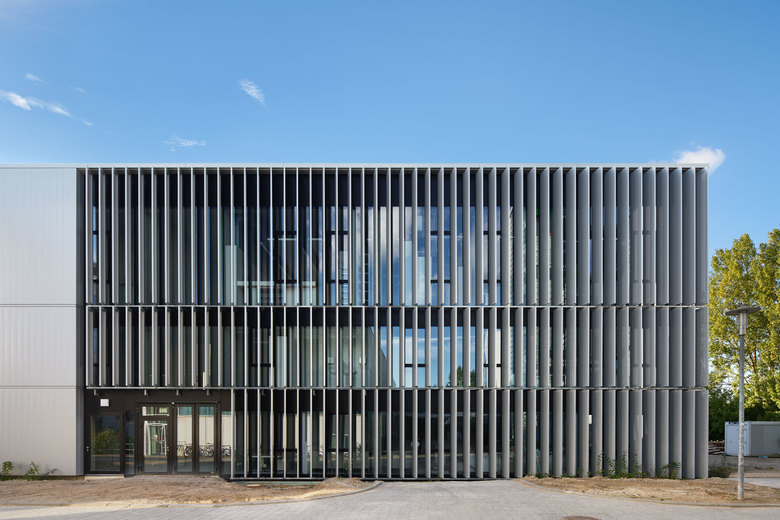 Lebendige Fassade, Schaufenster in die Forschung – Transparente Fassaden geben einen Einblick in Forschungstätigkeiten und öffnen sich bewusst dem Außenraum. Anders als bisher, findet damit die Forschung nicht hinter verschlossenen Fassaden statt, sondern wird sicht- und erlebbar. Zusammengehalten wird die gewonnene Einheit von Neubau und bestehenden Gebäuden durch ein durchlaufendes Fassadenband. Die Fassade besteht aus eloxierten, weiß-silbernen Aluminiumblechpaneelen, die als fest montierte Paneele vor geschlossenen Wandscheiben liegen oder als flexible Klapplamellen vor verglasten Bereichen. Als Klapplamellen dienen sie dem Sonnenschutz. Durch die unterschiedlichen Positionen und Ausrichtungen der Sonnenschutzlamellen bietet sich ein abwechslungsreiches Bild für den Betrachter. In den offenen Bereichen wird der Sonnenschutz durch eine Sonnenschutzverglasung gewährleistet.