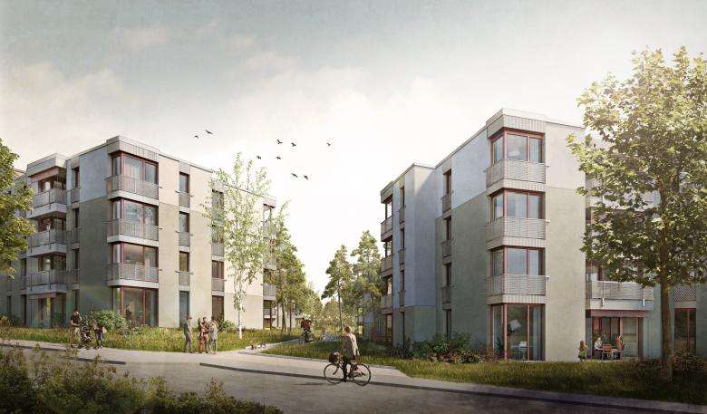 Die vorgeschlagene Setzung der neuen Gebäudevolumen führt die hohe Qualität des Bestandes weiter. Das Verhältnis von Baukörper und Freiraum ist aufeinander abgestimmt. Der Wohnpark zeichnet sich durch die sanfte topografische Gestaltung mit Wiesen- und Rasenflächen aus.