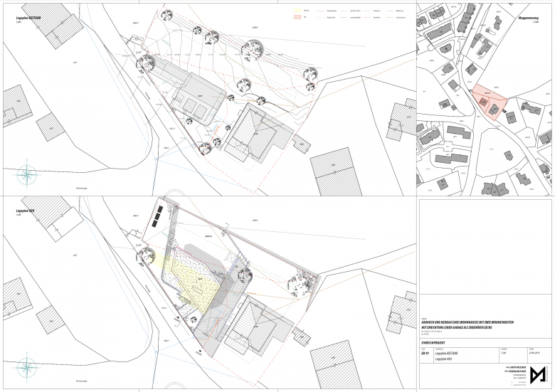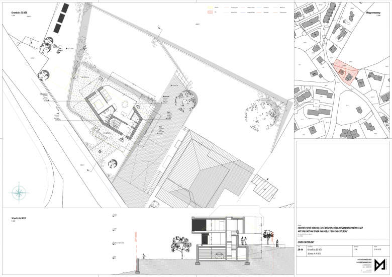 The building disposes of three floors. The partly underground basement offers storage space and cellar rooms, a garage as well as technical facilities. The ground floor has a little housing unit, whereas the spacious apartment is located in the wide projecting first floor. The staircase develops along a glazed airspace that serves as a light-catcher for the entire entrance. The living spaces on the ground and first floor open up through generous floor-to-ceiling glazing towards the landscape, while the facades facing the street side are mainly closed.