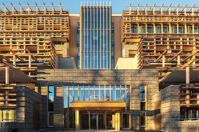 Exklusive Architektur und höchste ökologische Standards vereint das Medical Wellness Hotel auf dem Bürgenstock. Dank seiner Terrassenstruktur und der begrünten Flachdächer fügt sich das Waldhotel in das Landschaftsbild ein. Das Gebäude besteht aus natürlichen Materialien. So stammen etwa die Steine der Fassade vom vorher abgetragenen Hang und unterstreichen somit die ökologischen Gedanken bei der Konzeption des Gebäudes.