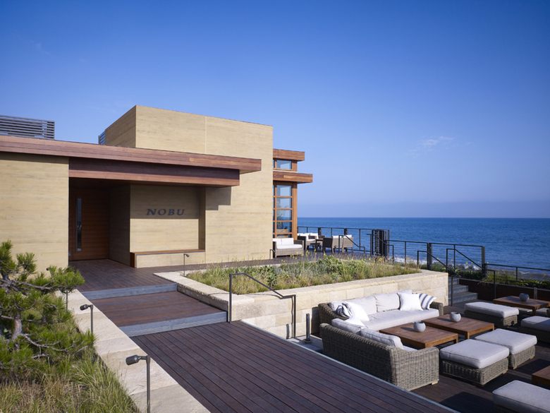 With its panoramic views of the Pacific Ocean, Nobu’s low horizontal profile hugs the bluff along the famed Pacific Coast Highway in Malibu, blending the Japanese notion of integration with the land and a quintessentially Californian celebration of light and openness. The bright palette of natural materials, including board-form concrete, bleached wood, and stone, reflects the abundant daylight emitted through clerestories and enormous floor-to-ceiling window walls. Wood plank and decomposed granite walkways wind through native planting and the shoji-inspired screen entry doors and into the space, where intimate dining nooks and continuous view corridors reinforce the linearity and connection to the outdoors. Sheltered outdoor decks and interior fire features allow diners to enjoy the beachfront views in an elegant yet comfortable setting year-round.