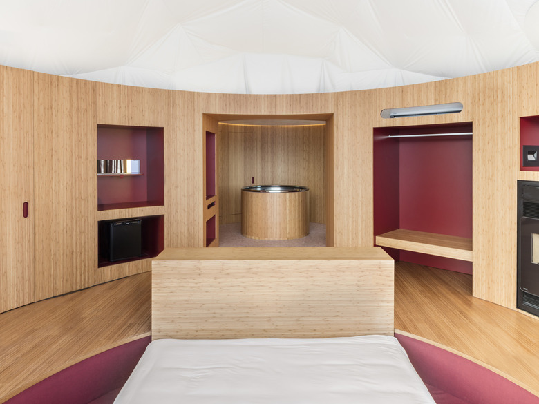 The pod design was inspired by the concept of Zen as well as Wu Ting movement theory, which postulates that “everything is connected, everything is energy.” The interconnectivity and the notion of ritual of the five natural elements informs both the Pods’ exterior and interior. A central circle - that conceptually represents the cycle of time - is shifted and duplicated to create a relative positioning of programmatic spaces. The wooden walls are curved to define these spaces and finished with precise details.