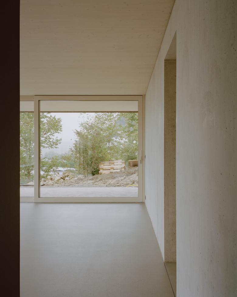 Der zweigeschossige Bau besteht aus einem massiven Sockel und einem darauf gesetzten Holzbau. Die Topografie wird zum ordnenden Prinzip: Eine Wand, parallel zur Hangneigung geführt, teilt das Haus in einen vorderen, zum Tal orientierten Wohnbereich und einen rückwärtigen Teil mit dienenden Räumen wie Eingang, Bädern und Technik.