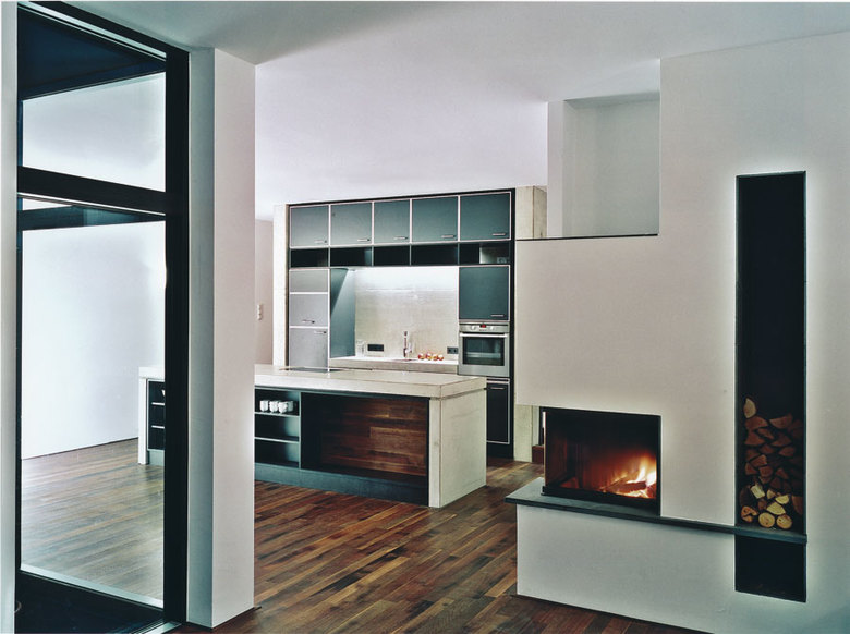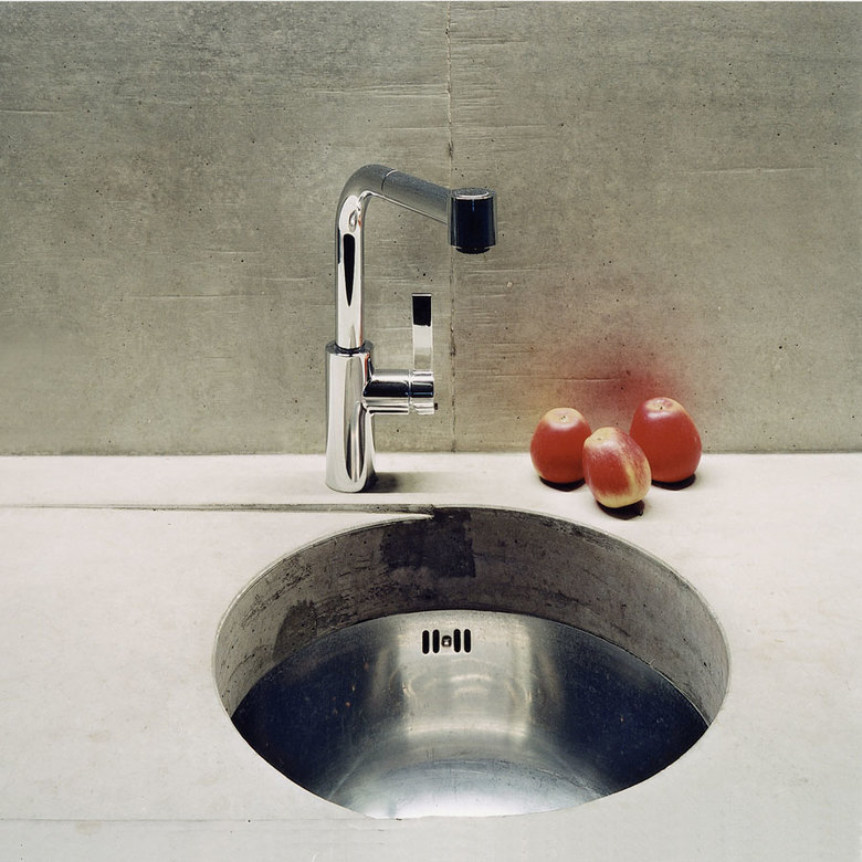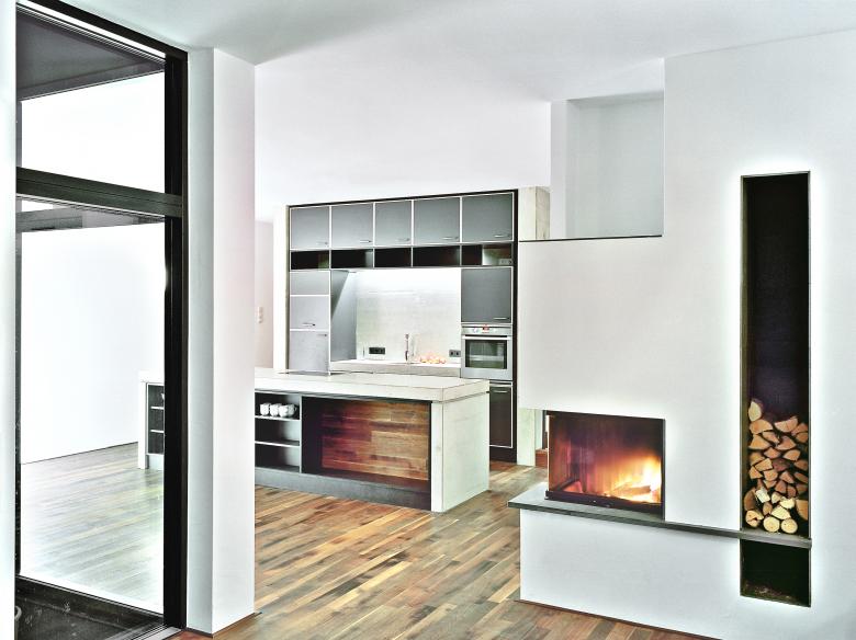 Im Innern des Hauses dominieren schlichte weiße Wände und Decken mit dem sachlichen, klaren Sichtbeton und dem lebendigen, kräftigen Holzdielenboden (Thermo-Eiche). Diese Materialien werden zu Bauteilen ausgeformt, wie zum massiven Küchenblock als standhaften Treffpunkt für Familie, Freunde und natürlich Nachbarn.