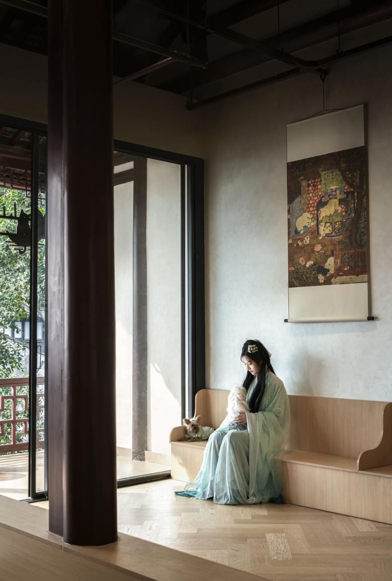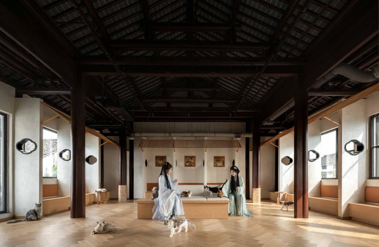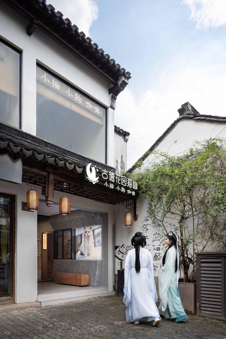 The exterior maintains the traditional dark-tile roofing style, drawing attention through refined signage, warm lighting, and inviting elements such as the second-floor terrace and display windows. As guests pass through the hallway and ascend the staircase, they discover a surprisingly expansive and engaging pet café on the second floor—a hidden oasis awaiting exploration.