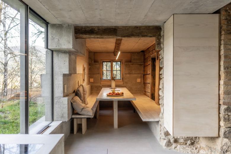 Im Haus sind die notwendigsten Dinge: ein Ofen, ein Herd, ein Tisch, ein Bett, ein Bad, eine Speis, WLAN und Bücher.