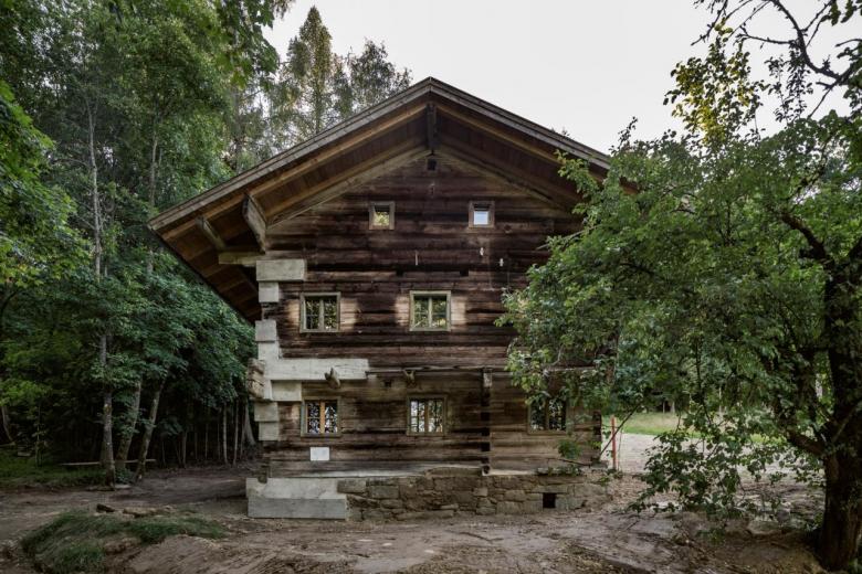 Neue Betonbarren umborden das Haus. Sie stützen das Holz. Sie machen das Haus bewohnbar.