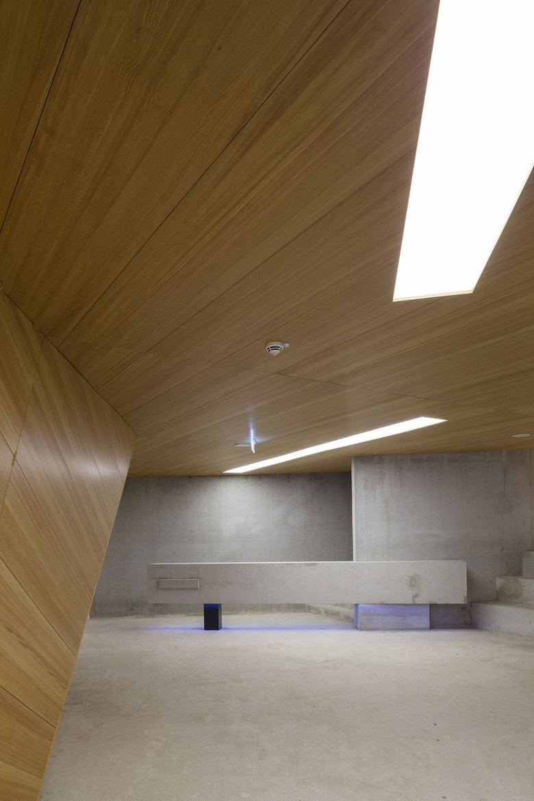 Der monolithische, gekippte Baukörper öffnet sich für die Konzertbesucher auf dem neuen Dorfplatz und führt von dort diese über eine Treppe hinab in das unter der Erdoberfläche liegende Foyer. Dieses erschließt nicht nur die Funktionsräume wie die Garderobe, die Sanitärräume sowie den Barbereich, sondern führt auch spannungsreich um den Zuschauerraum herum ins Innere des Konzertsaales. Dieser entfaltet seine Akustik innerhalb des leicht wirkenden Betonkörpers, dessen präzise Lichtschlitze den Raum beleuchten. Der Baukörper des Konzertsaales ist in Ortbeton gefertigt, dessen diffizile Form nur mittels einer äußert aufwändig konstruierten Schalung realisiert werden konnte. Die dominanten gekippten Oberflächen des Konzertsaales sind allein akustischen Vorgaben geschuldet und beinhalten hinter ihren Schlitzen neben LED-Leuchten auch Bassabsorber, die eine optimale Akustik bieten. Der Beton im Inneren des Konzertsaals ist unbehandelt. Seine lebendigen Oberflächen dienen dazu, die mittelhohen Töne zu absorbieren. Die Schräge des Baukörpers - bedingt durch die Steigung des Hanges - trägt die Zuschauertribüne, deren transparent wirkenden Stühle über Lichtschlitzen zu schweben scheinen. Die Stühle sind auf Eisenschwertern aus Stahl, auch unter den Stufengängen sind Absorber eingebaut. Die Bühne des nicht als Multifunktionsraum, sondern allein als Konzertsaal konzipierten Gebäudes ist mit moderner LED Bühnentechnologie ausgestattet.