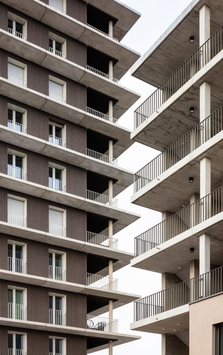 Auf Grund der viel befahrenen Straße wurde die straßenbegleitende Bebauung als Laubenganghaus entworfen. Die Ausführung des Laubengangs als ebenso robuste wie feine Struktur aus Betonfertigteilen ist eine bewusste Reminiszenz an den „poetischen Rationalismus“. Der geschützte Raum zwischen den Baukörpern fungiert als innerstädtische Oase, von deren Mitte das Gebäudeensemble erschlossen wird.