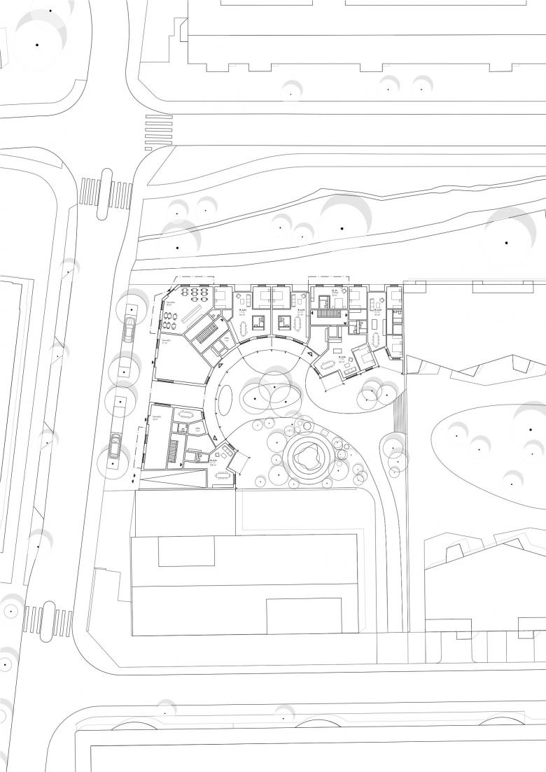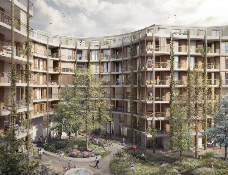 Der begrünte Hof wird zu einem Hauptaugenmerk der Überbauung. Die Architektur schirmt das Urbane ab und schafft eine ruhige und naturnahe Umgebung im Innenhof. Die geschwungene Gebäudekante ist Vorbild für die organischen Formen der Beete, wo Sträucher und Bäume wachsen. Die Wege sind fliessend, aber dennoch direkt und funktional. Die Sitzgelegenheiten bieten Begegnungsmöglichkeiten. Der Garten setzt sich aus einer hügeligen Spiellandschaft zusammen.