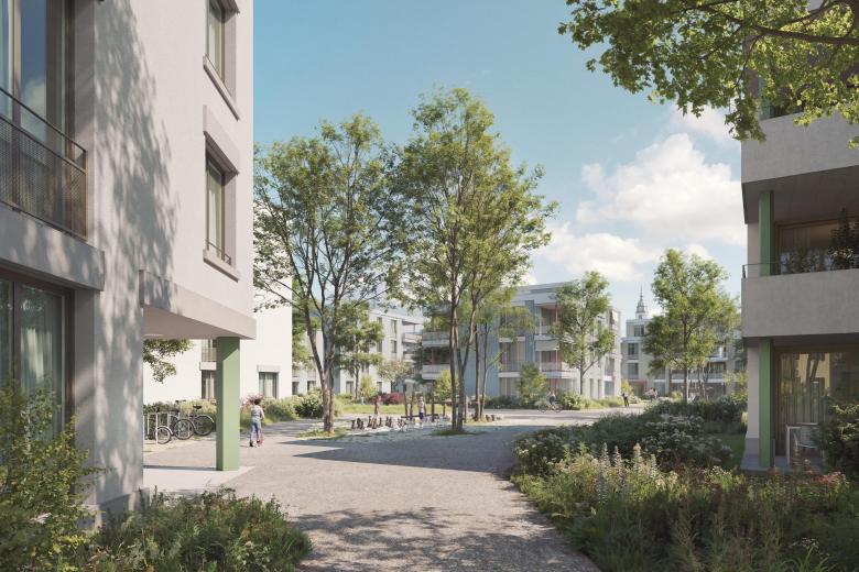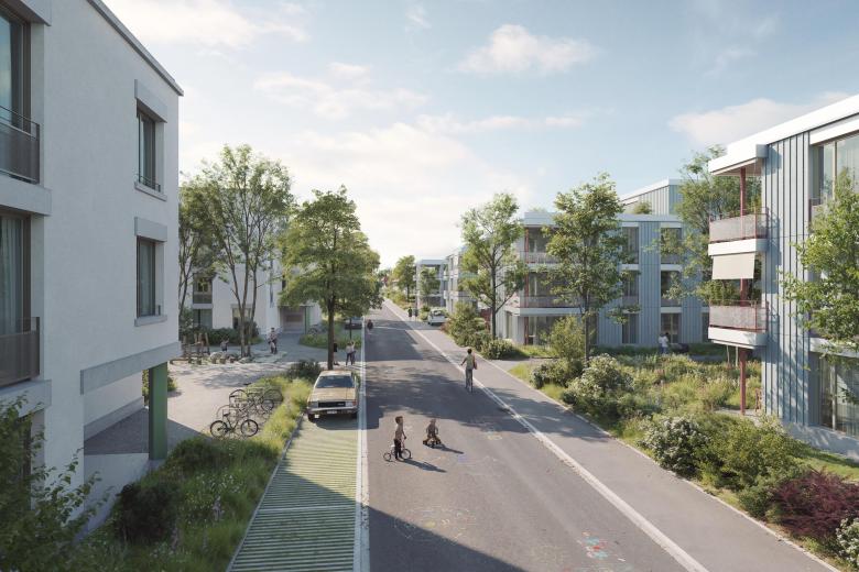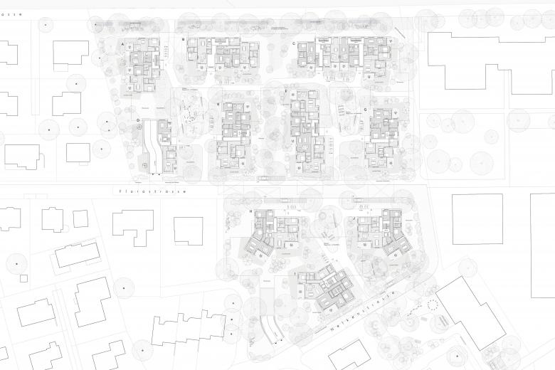 Der Entwurf nimmt die städtebauliche Logik des westlich angrenzen-den Quartiers auf und entwickelt sie in einer eigenständigen und kohärenten Weise weiter. Die Bebauung ist in einzelne Häusergruppen gegliedert, die sich um attraktive Hofräume gruppieren. Spannende Sichtachsen eröffnen den Blick in die durchgrünten Zwischenräume und schaffen so visuelle Verbindungen und räumliche Offenheit. Ein durchgehendes Wegnetz verbindet alle Bereiche miteinander und sorgt im gesamten Quartier für eine klare, intuitive Orientierung sowohl in der Quer- als auch in der Längsrichtung.