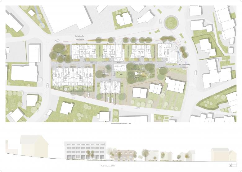 In der ersten Etappe des neuen Areals als Basis-Stufe wird ein wirksamer Freiraum erbaut, der neben dem Naturspielplatz und einer chaussierten Freifläche einen temporären Pavillon aus Abbruch-Material inkludiert, der als Treffpunkt und als Informationsquelle über die Veränderung des Quartiers dient. Die Bepflanzung um die Häuser und auf den Grünflächen werden so errichtet, dass sie in der weiteren Bebauungsphase bestehen bleiben oder umgepflanzt werden können.