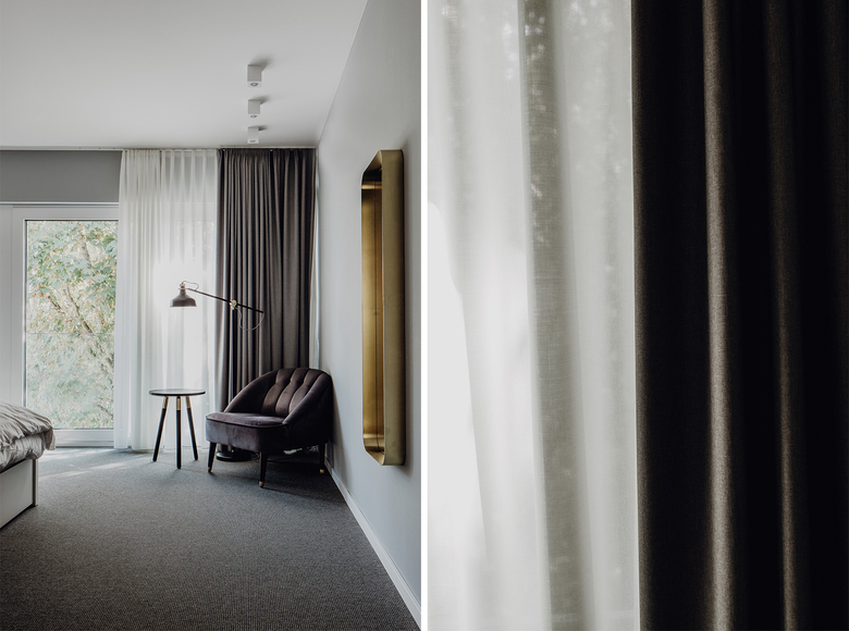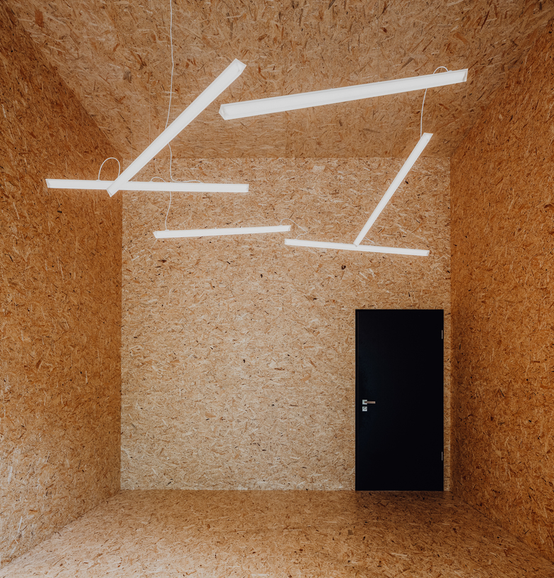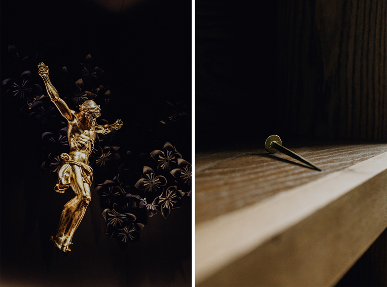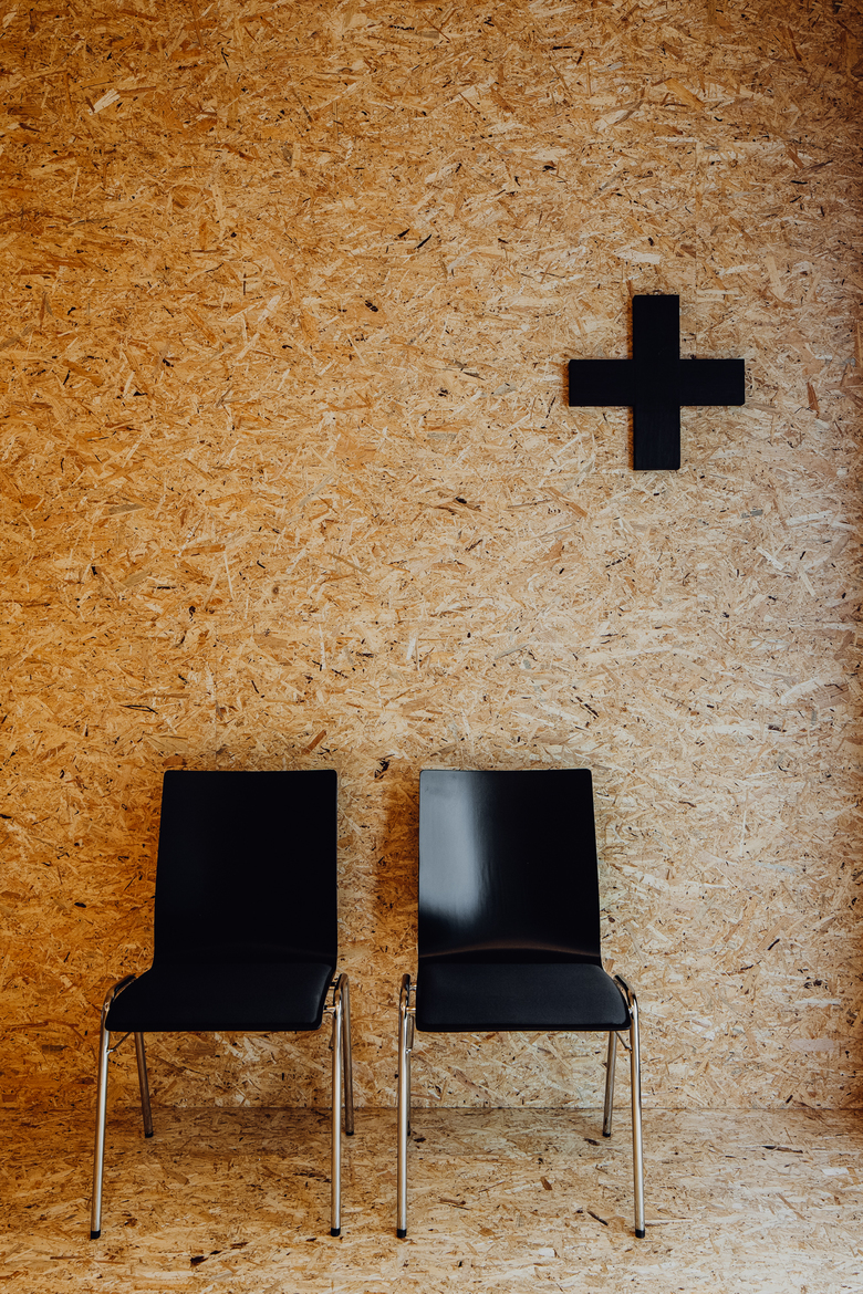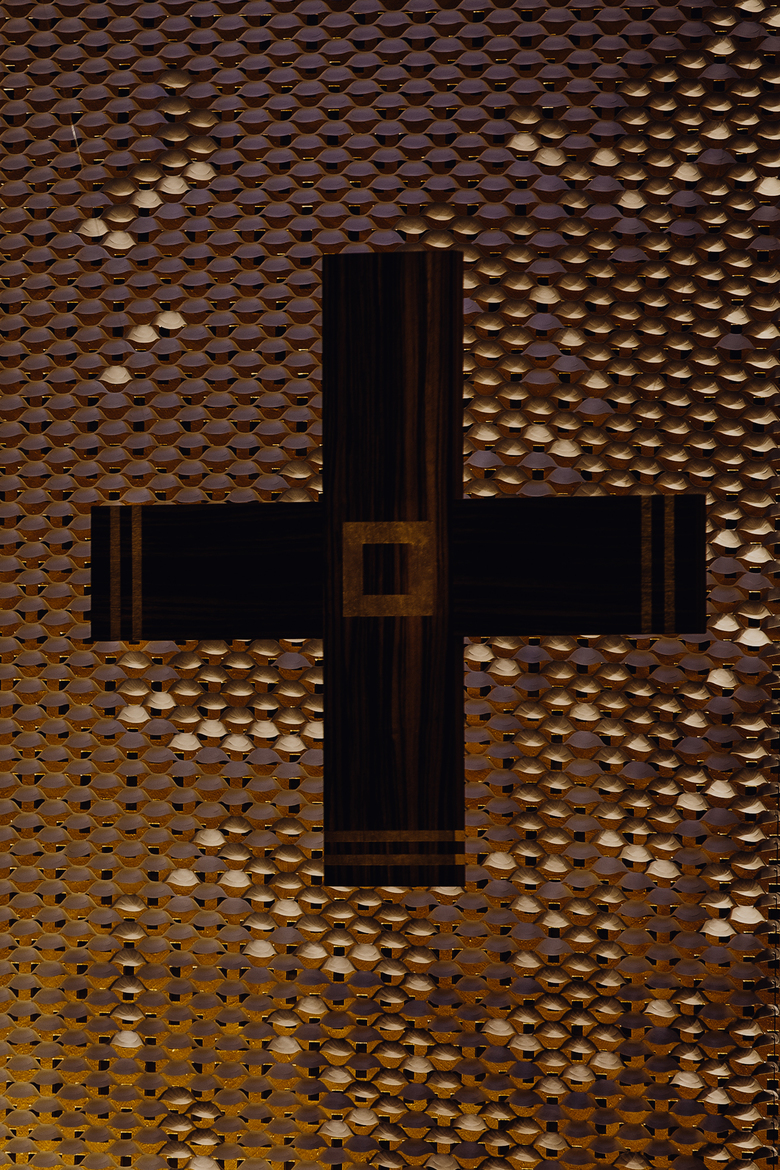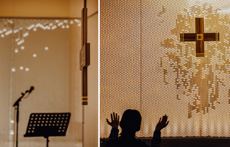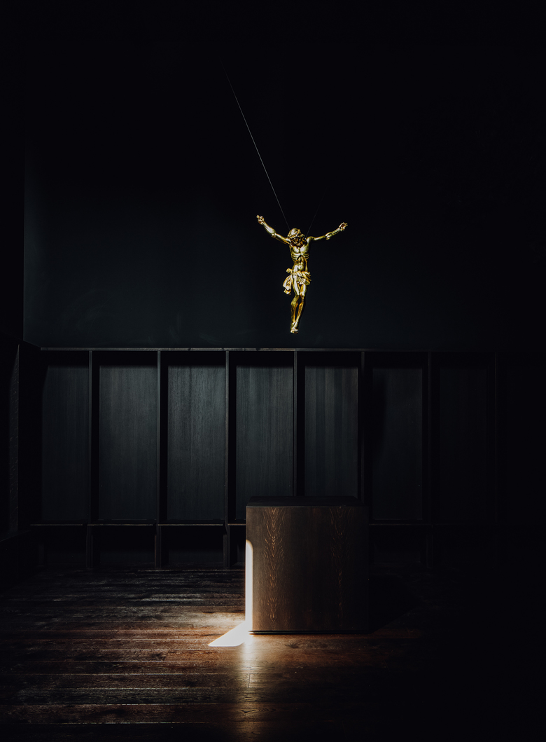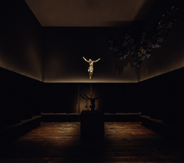 Dem in helles Gold und Weiß gehüllten Gebetsraum, welcher Tag und Nacht mit lebendigem, lautem Gebet erfüllt ist, steht eine würfelförmige ganz in schwarz gehaltene Kapelle als ein Ort der Stille und Kontemplation entgegen. Dunkle Räuchereiche am Boden zieht sich über das Chorgestühl und über die Wände ringsum als eine einheitliche Fläche durch den gesamten Raum. Zentral im Raum hängt ein großes goldenes Kruzifix und konzentriert die Blicke der Andächtigen auf sich. Lediglich ein schmales Fenster in der obersten Wanddecke lässt einen dünnen Lichtstrahl in den dunklen Raum fallen und fokussiert den Christus am Kreuz. Es braucht Zeit, ein Verweilen, bis das Auge langsam eine freie Struktur auf der schwarzen Wand entdeckt: Filzblüten in dunkelgrau und blau, welche die Stringenz des Raumes durchbrechen und den goldenen Jesus sanft umrahmen. Ein andächtiger Ort, der dem Allerheiligsten gleicht und sich wie ein modern interpretiertes Zitat einer klassischen Kapelle liest.