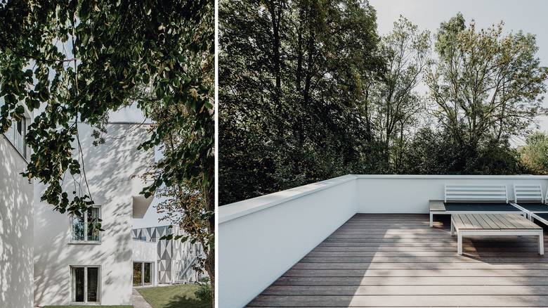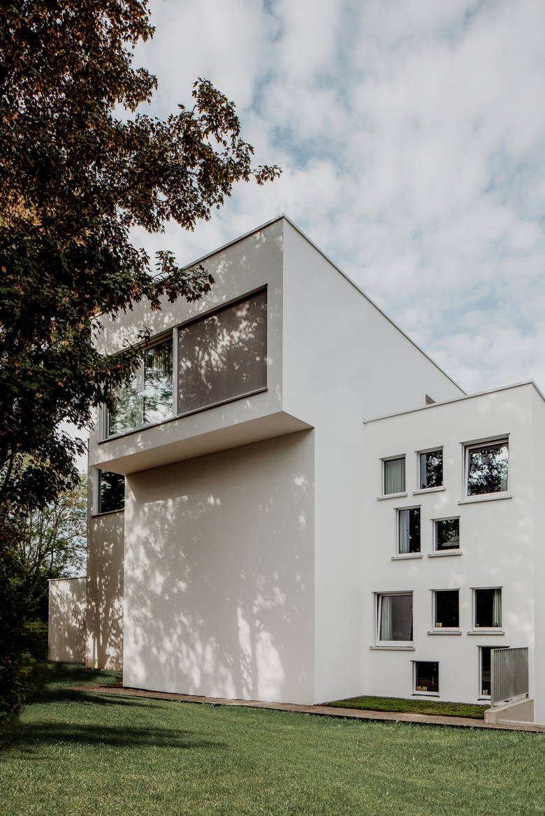 Der Neubau des zweiten Bauabschnitts bildet mit seinen unterschiedlich groß gestaffelten, differenzierten weißen Kuben einen Kontrapunkt zur klaren geometrischen Form des Bestandsgebäudes. Dass moderne Tapeten nicht nur für die Gestaltung von Innenräumen geeignet sind, zeigt die mit einer lebhaften Außentapete gestaltete Fassade dieses Baukörpers.