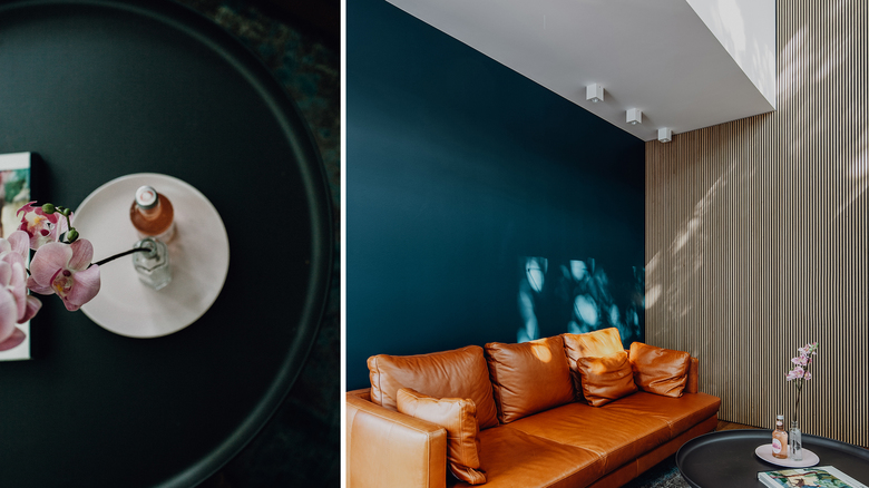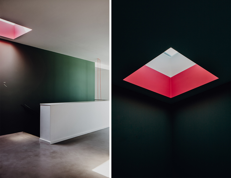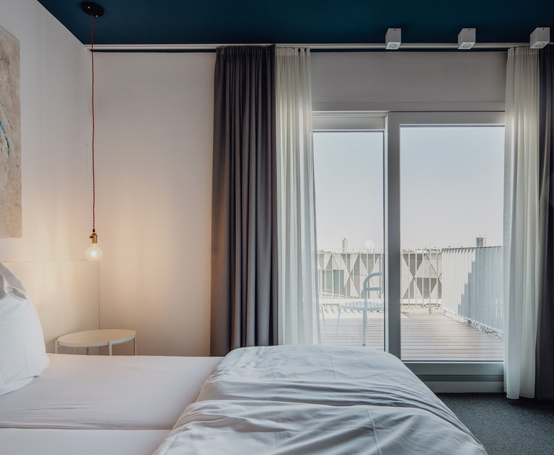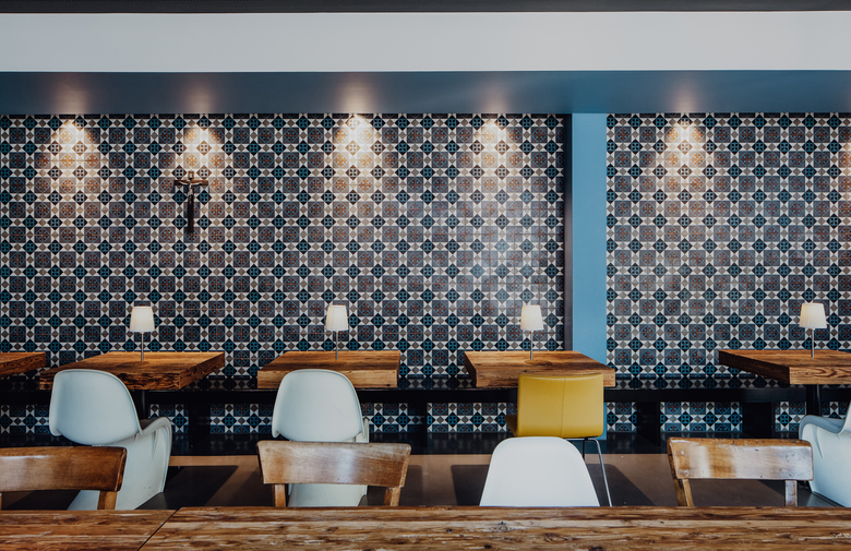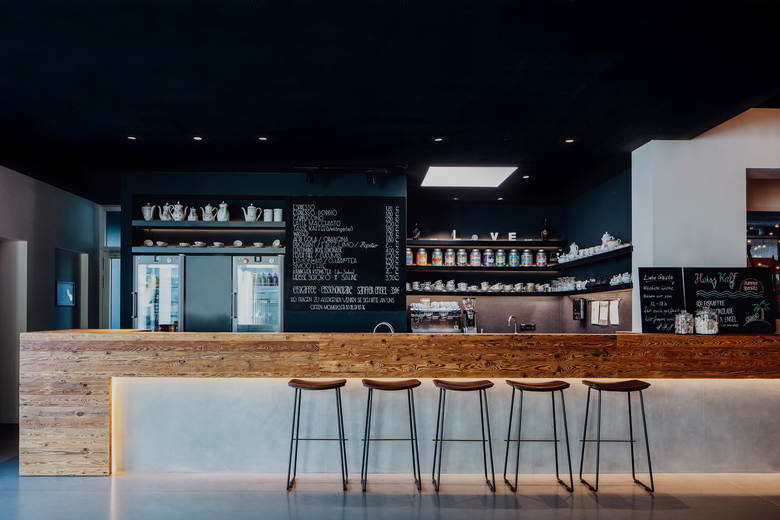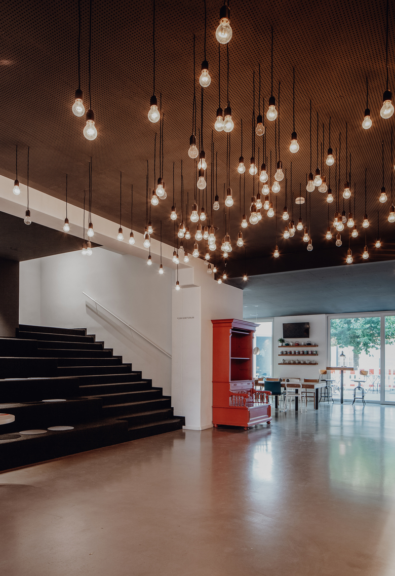 Den Mittelpunkt des Gebetshauses bildet ein Platz, an dem sich alle internen Wege kreuzen und der zum einen das Foyer zum anderen aber auch ein schickes Café umfasst. Hunderte von Glühbirnen pendeln in unterschiedlichen Höhen von der Decke. Eine endlos lange Theke aus Sichtbeton bildet die klassische Rezeption für die Gäste, diese Theke zieht sich nahtlos durch den gesamten Raum und fungiert so auch als Theke des Cafés. Im Zentrum des Cafés steht ein massiver Eichentisch dekoriert mit bunten Punktleuchten, die den Raum in ein warmes und behagliches Licht tauchen und zu geselligem Verweilen animieren. Die ganze Rückwand des Cafés ist mit Mosaikfliesen der Marke VIA verkleidet und bildet zusammen mit einer davor stehenden langen Sitzbank die Kulisse für kleine Cafétische mit eingelassenen Schirmlämpchen. Ein Ort, der weit entfernt ist von klösterlicher Stille, der jedoch den Rahmen für entspannte Begegnung schafft.