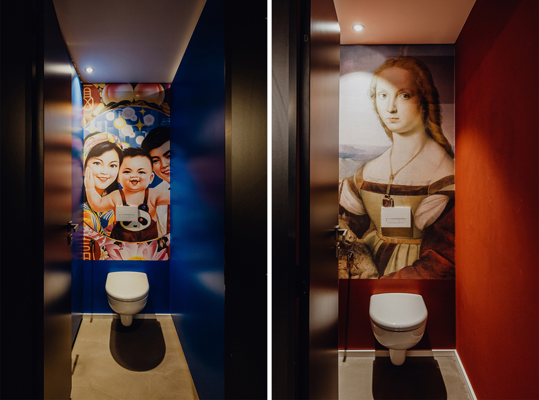 Kaum einmal wird in einer Beschreibung der Architektur eines Gebäudes über die Toiletten berichtet. Schon gar nicht, wenn es sich um einen solchen sakralen Komplex handelt. Beim Gebetshaus Augsburg führt daran jedoch keine Weg vorbei. Zu einzigartig sind diese profanen Orte menschlicher Bedürfnisse in diesem Fall gestaltet. Ist der Vorraum zu den WCs noch in schlichtem betongrau und anthrazitschwarz gehalten, überrascht die Besucher in jeder einzelnen Kabine eine humorvolle, farbenprächtige Ausgestaltung. Diese reicht von den großen Augen einer Milchkuh über ein Camouflage-Muster bis hin zum Renaissancegemälde und weiteren interessanten Motiven.