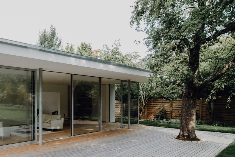 In einer Split-Level-Bauweise folgen jeweils durch ein halbes Geschoss getrennt das Familien-Rückzugszimmer, die Kinderebene und ganz oben das Elternschlafzimmer. Der an den Küchenbereich anschließende rechteckige Wohnbereich öffnet sich durch raumhohe Verglasungen in den rückwärtigen Garten. Die schwellenlose Übereckverglasung lässt jegliches Gefühl räumlicher Begrenzung verschwinden. Alles scheint ins Grüne zu fließen. Der Holzbodenbelag zieht sich bis auf die Terrasse, über die das Dach weit hinausragt.