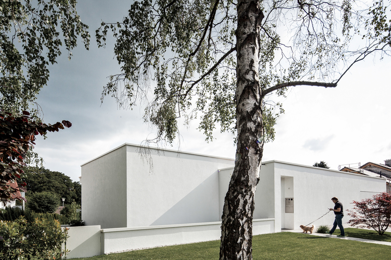 Dem Wunsch der Bauherren nach einem Haus mit Flachdach konnte aufgrund anderslautender Bauvorschriften nur über eine optische Hilfe Rechnung getragen werden - ein versenktes Walmdach. Über die Erhöhung der Attikawände ist so der optische Eindruck eines kubischen Flachdachs gelungen.