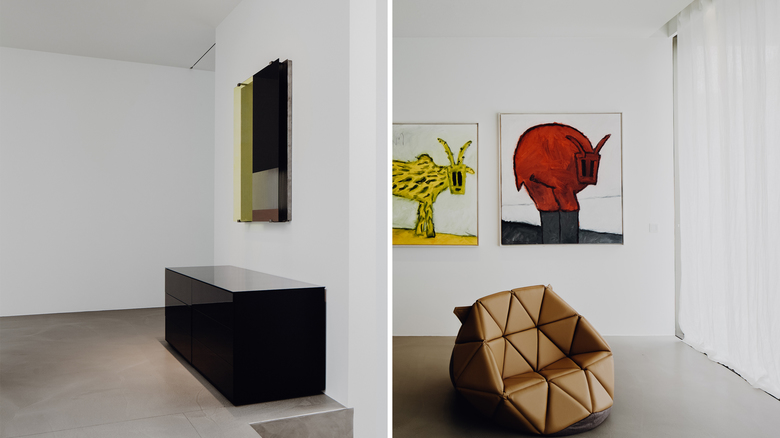 Von dort aus geht es weiter in einen weitgespannten, loftartigen Bereich, der Essen und Kochen beherbergt und über die imposante Fensterfassade den Blick auf Garten und Pool freigibt. Bis zu 18 m² große Panorama-Schiebefenster wurden schwellenlos in die Fassade integriert. Das großzügige Loft-Feeling wird von dem auf die Terrassen durchlaufenden Sichtbetonboden zusätzlich unterstrichen. Es zeigt sich der puristische Wohnstil, dessen Ambiente durch wenige, hochwertige Möbelstücke bereichert wird: Ein Sofa in der Ecke, ein weißer Tisch, ausgewählte Kunstwerke.