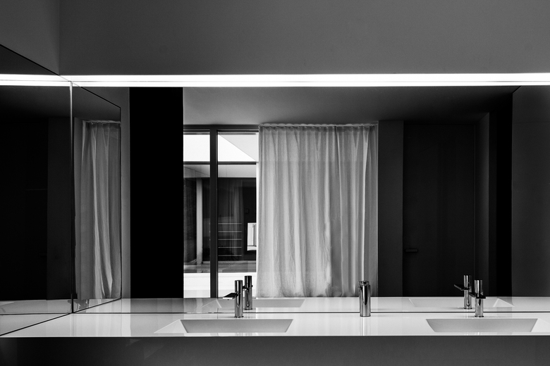 Besucher betreten das Gebäude, das sich nach außen als geschlossener Kubus zeigt, im Erdgeschoss und erahnen sofort die atemberaubende Architektur, die sich ihnen wenige Momente später offenbaren wird. Man wird in einem Foyer empfangen, das dank eines Wasseratriums - ein zum Himmel geöffneter Lichtkanal, am Grund mit einem Wasserbecken versehen - lichtdurchflutet ist. Die hier angebrachte Streetart-Graffiti bildet einen Kontrapunkt zum puristischen Interior Design und prägt markant das Entree.
