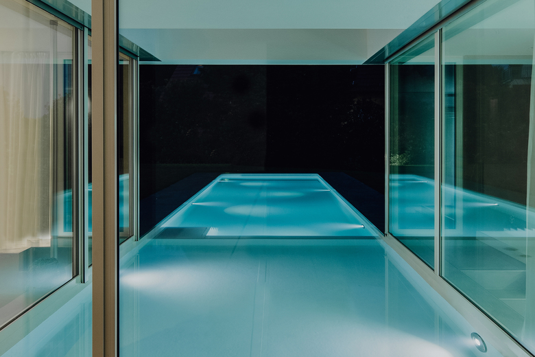 Der eigenwillig in die Fassade geschobene Pool ist mit Solartechnik ausgestattet und zusätzlich über einen Wärmetauscher an die Luft-Wasser-Wärmepumpe der Haustechnik angeschlossen. Er kann somit ganzjährig geheizt und genutzt werden. In den Grundriss integriert grenzt der Pool unmittelbar an das Schlafzimmer und den Wellnessbereich und verzahnt somit Innen und Außen. Die Lichtreflexionen an Wänden und Decken sind darüber hinaus ein wunderbares Gestaltungselement